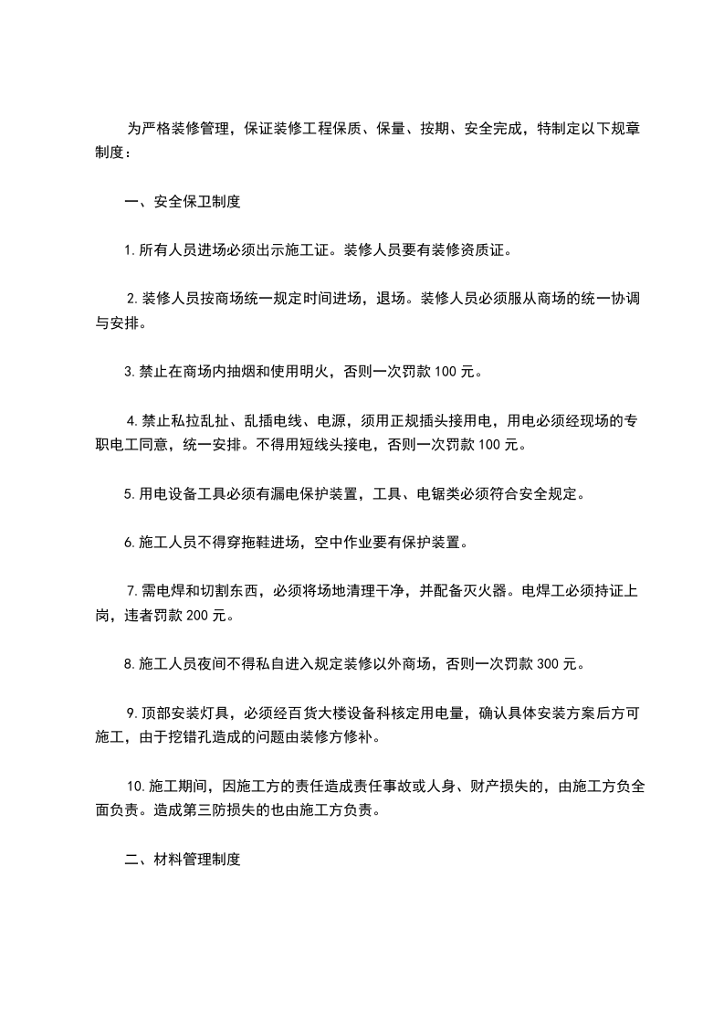 8.施工人员夜间不得私自进入规定装修以外商场,否则一次罚款300元。
