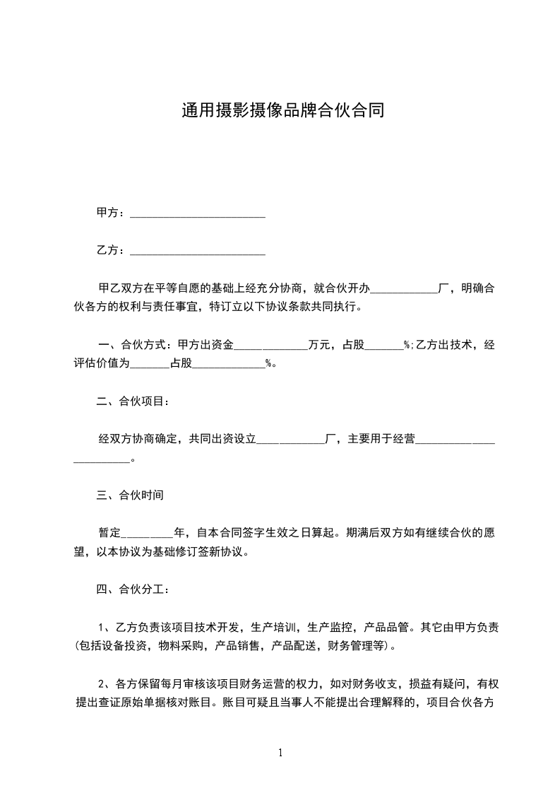 一、合伙方式:甲方出资金_____________万元,占股_______%;乙方出技术,经评估价值为_______占股_____________%。