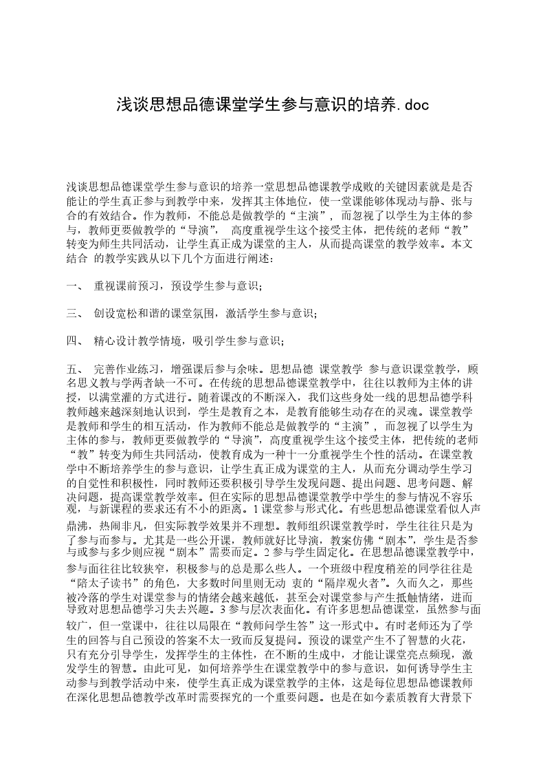 五、 完善作业练习,增强课后参与余味。思想品德 课堂教学 参与意识课堂教学,顾名思义教与学两者缺一不可。在传统的思想品德课堂教学中,往往以教师为主体的讲授,以满堂灌的方式进行。随着课改的不断深入,我们这些身处一线的思想品德学科教师越来越深刻地认识到,学生是教育之本,是教育能够生动存在的灵魂。课堂教学是教师和学生的相互活动,作为教师不能总是做教学的“主演”, 而忽视了以学生为主体的参与,教师更要做教学的“导演”,高度重视学生这个接受主体,把传统的老师“教”转变为师生共同活动,使教育成为一种十一分重视学生个性的活动。在课堂教学中不断培养学生的参与意识,让学生真正成为课堂的主人,从而充分调动学生学习的自觉性和积极性,同时教师还要积极引导学生发现问题、提出问题、思考问题、解决问题,提高课堂教学效率。但在实际的思想品德课堂教学中学生的参与情况不容乐观,与新课程的要求还有不小的距离。1课堂参与形式化。有些思想品德课堂看似人声鼎沸,热闹非凡,但实际教学效果并不理想。教师组织课堂教学时,学生往往只是为了参与而参与。尤其是一些公开课,教师就好比导演,教案仿佛“剧本”,学生是否参与或参与多少则应视“剧本”需要而定。2参与学生固定化。在思想品德课堂教学中,参与面往往比较狭窄,积极参与的总是那么些人。一个班级中程度稍差的同学往往是“陪太子读书”的角色,大多数时间里则无动 衷的“隔岸观火者”。久而久之,那些被冷落的学生对课堂参与的情绪会越来越低,甚至会对课堂参与产生抵触情绪,进而导致对思想品德学习失去兴趣。3参与层次表面化。有许多思想品德课堂,虽然参与面较广,但一堂课中,往往以局限在“教师问学生答”这一形式中。有时老师还为了学生的回答与自己预设的答案不太一致而反复提问。预设的课堂产生不了智慧的火花,只有充分引导学生,发挥学生的主体性,在不断的生成中,才能让课堂亮点频现,激发学生的智慧。由此可见,如何培养学生在课堂教学中的参与意识,如何诱导学生主动参与到教学活动中来,使学生真正成为课堂教学的主体,这是每位思想品德课教师在深化思想品德教学改革时需要探究的一个重要问题。也是在如今素质教育大背景下迫切需要去追求的目标。那么思想品德教师应如何培养学生在课堂教学中的参与意识,让学生真正成为课堂的主人,从而提高课堂的教学效率呢?