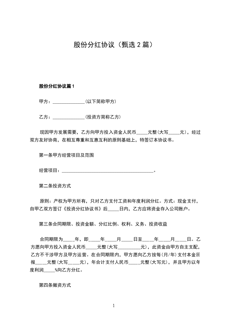 1、在公司经营活动中所得利润扣除各项开支,仍得以盈利的前提下,甲方从盈余中抽取___%的资金将对乙方予以分红。红利支付时间为每年的___月___日,以现金方式支付。