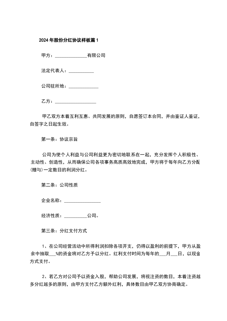 2024年股份分红协议样板篇1