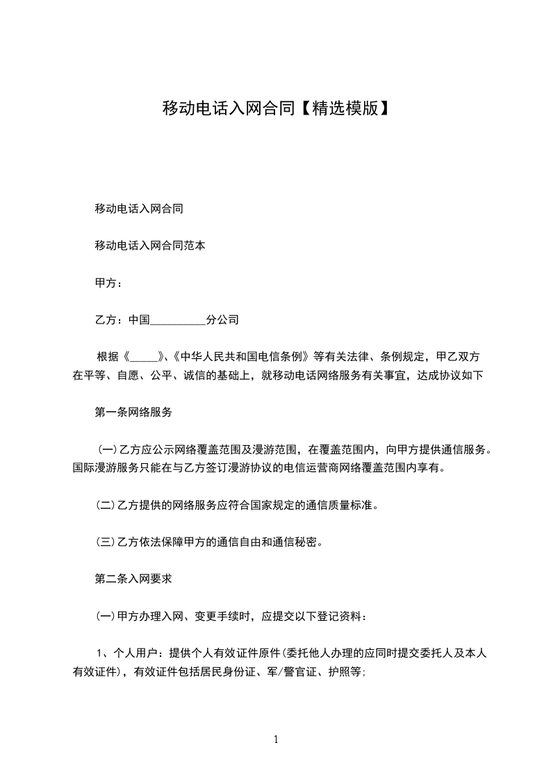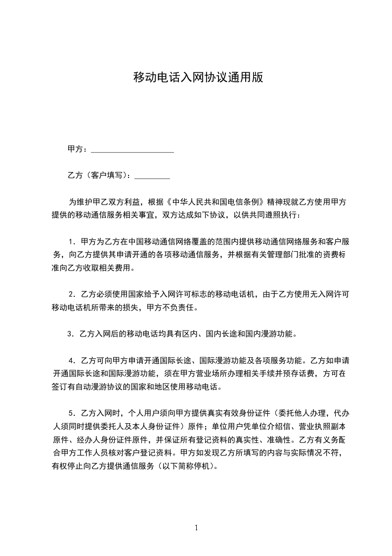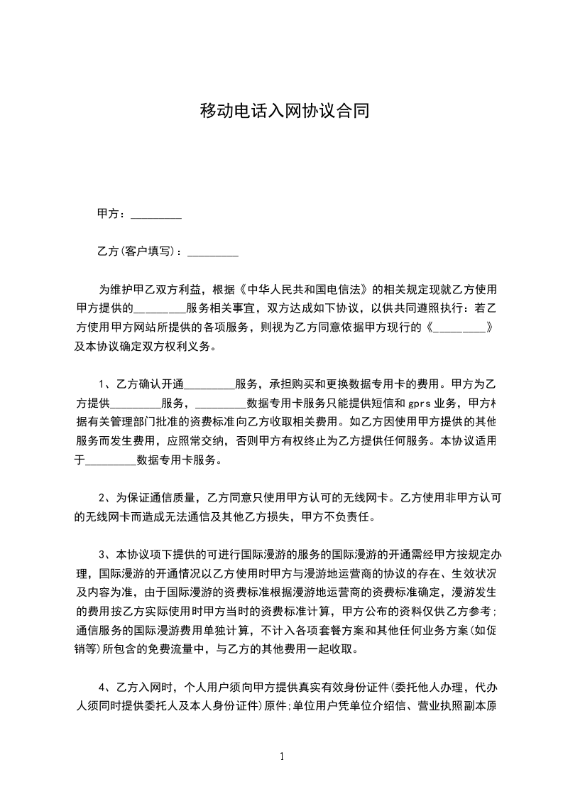 合同是一个承诺或一系列承诺,违反该承诺将由法律赐予救济;履行该承诺是法律所确认的义务。今日.我要与大家分享的是:移动电话入网协议相关合同范本,具体内容如下,欢迎阅读! 移动电话入网协议 为爱护客户的通信权利,维护中国网络通信集团公司_分公司(以下简称本公司)合法的通信经营权,本公司将向客户供应业务受理登记单中确认的固定电话的服务项目,双方本着自愿、公平的原则,达成协议如下: 甲方:_ 乙方(客户填写):_ 为维护甲乙双方利益,依据中华人民共和国电信条例精神现就乙方用法甲方供应的移动通信服务相关事宜,双方达成如下协议,以供共同遵照执行: