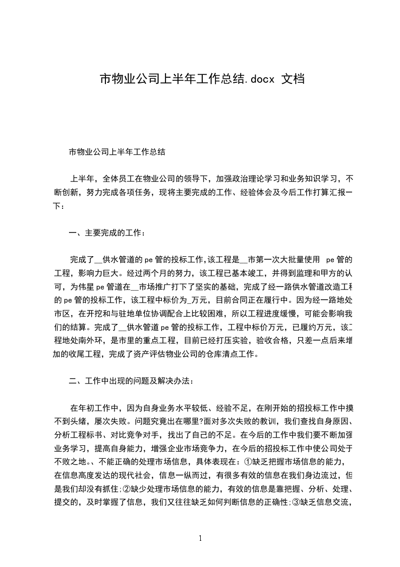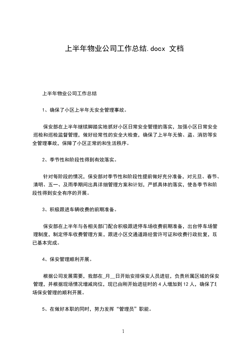 三、档案管理方面档案是在物业管理中直接形成的文件材料,严格根据档案管理规定对业主资料、各部门档案、报修单、工作联络函、放行条等资料进展较彻底的分类整理,做到名目清楚,检索便利,各栋住户资料进展盒装化、各部门档案进展袋装化管理,按期、细致的整理完成。实现标准化管理,同时制定完善资料的保密制度。定期检查档案状况,改动或缺少准时完善。上半年共接到各类报修共64宗,办理放行条42张,工作联络函10张。