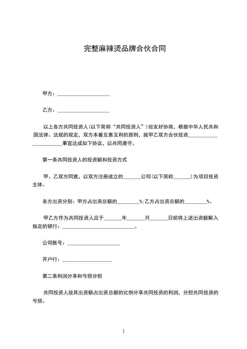 1、甲方____________以现金方式出资,共计人民币_________元整。