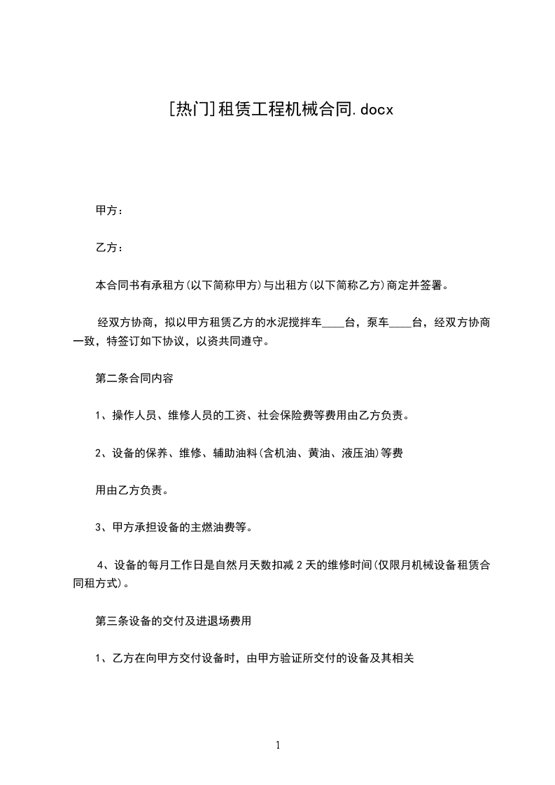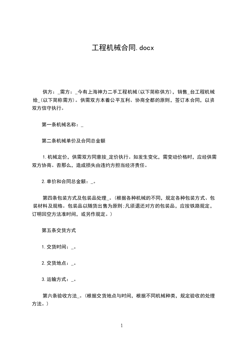 供方:_需方:_今有上海神力二手工程机械(以下简称供方),销售_台工程机械给_(以下简称需方)。供需双方本着公平互利、协商全都的原则,签订本合同,以资双方信守执行。