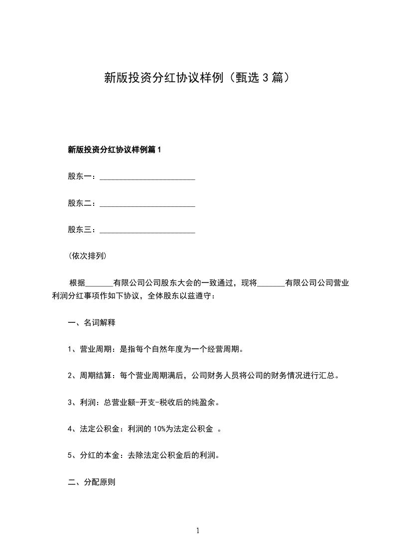 新版投资分红协议样例篇1
