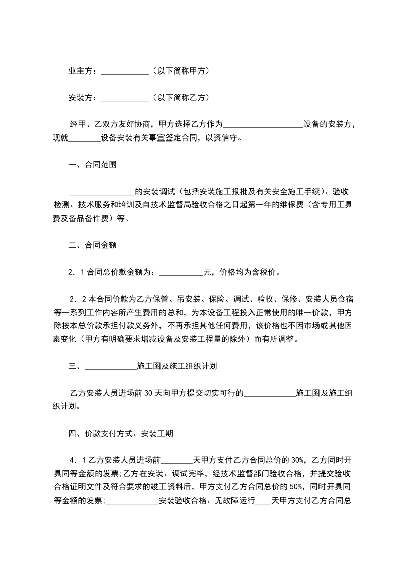 经甲、乙双方友好协商,甲方选择乙方作为____________________设备的安装方,现就________设备安装有关事宜签定合同,以资信守。