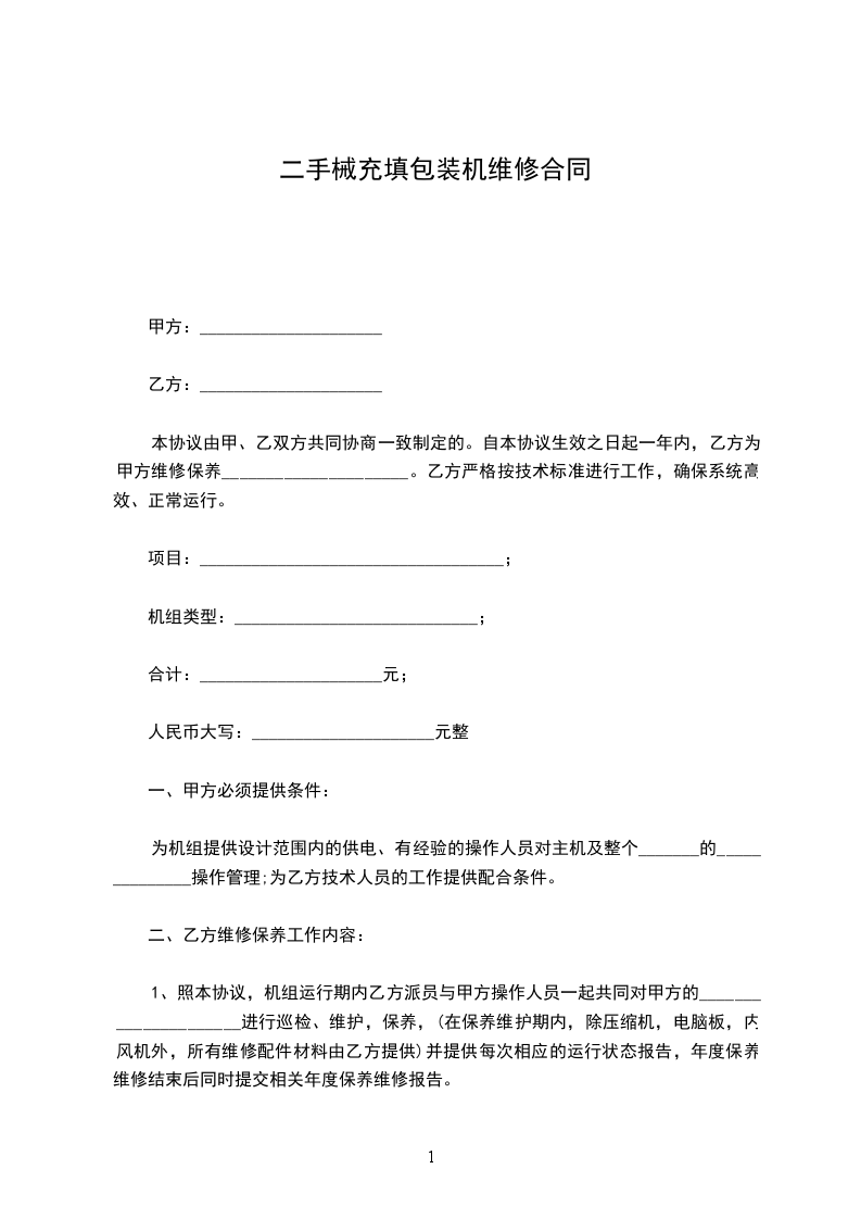 二手械充填包装机维修合同