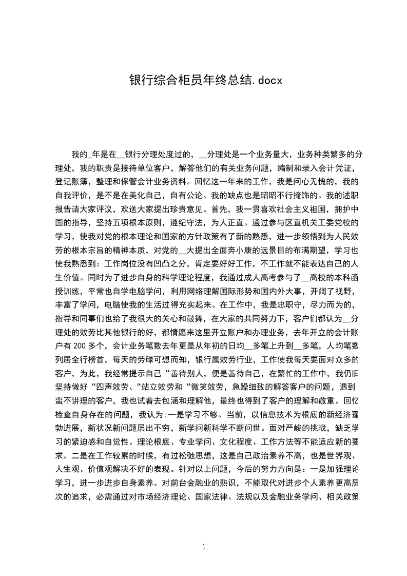 我的_年是在__银行分理处度过的,__分理处是一个业务量大,业务种类繁多的分理处,我的职责是接待单位客户,解答他们的有关业务问题,编制和录入会计凭证,登记账簿,整理和保管会计业务资料。回忆这一年来的工作,我是问心无愧的,我的自我评价,是不是在美化自己,自有公论。我的缺点也是昭昭不行掩饰的。我的述职报告请大家评议,欢送大家提出珍贵意见。首先,我一贯喜欢社会主义祖国,拥护中国的指导,坚持五项根本原则,遵纪守法,为人正直。通过参与区直机关工委党校的学习,使我对党的根本理论和国家的方针政策有了新的熟悉,进一步领悟到为人民效劳的根本宗旨的精神本质,对党的__大提出全面奔小康的远景目的布满期望,学习也使我熟悉到:工作岗位没有凹凸之分,肯定要好好工作,不工作就不能表达自己的人生价值。同时为了进步自身的科学理论程度,我通过成人高考参与了__高校的本科函授训练,平常也自学电脑学问,利用网络理解国际形势和国内外大事,开阔了视野,丰富了学问,电脑使我的生活过得充实起来。在工作中,我是忠职守,尽力而为的,指导和同事们也给了我很大的关心和鼓舞,在大家的共同努力下,客户们都认为__分理处的效劳比其他银行的好,都情愿来这里开立账户和办理业务,去年开立的会计账户有200多个,会计业务笔数去年更是从年初的日均__多笔上升到__多笔,人均笔数列居全行榜首,每天的劳碌可想而知,银行属效劳行业,工作使我每天要面对众多的客户,为此,我经常提示自己“善待别人,便是善待自己,在繁忙的工作中,我仍旧坚持做好“四声效劳、“站立效劳和“微笑效劳,急躁细致的解答客户的问题,遇到蛮不讲理的客户,我也试着去包涵和理解他,最终也得到了客户的理解和敬重。回忆检查自身存在的问题,我认为:一是学习不够。当前,以信息技术为根底的新经济蓬勃进展,新状况新问题层出不穷,新学问新科学不断问世。面对严峻的挑战,缺乏学习的紧迫感和自觉性。理论根底、专业学问、文化程度、工作方法等不能适应新的要求。二是在工作较累的时候,有过松弛思想,这是自己政治素养不高,也是世界观、人生观、价值观解决不好的表现。针对以上问题,今后的努力方向是:一是加强理论学习,进一步进步自身素养。对前台金融业的熟识,不能取代对进步个人素养更高层次的追求,必需通过对市场经济理论、国家法律、法规以及金融业务学问、相关政策的学习,增加分析问题、解决问题的力量,二是增加大局观念,转变工作作风,努力抑制自己的消极心情,进步工作质量和效率,乐观协作指导同事们把工作做得更好。