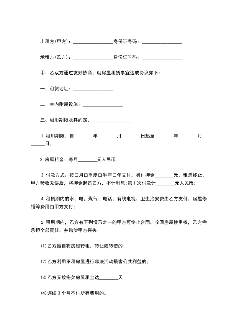 出租方(甲方):_________________身份证号码:_________________