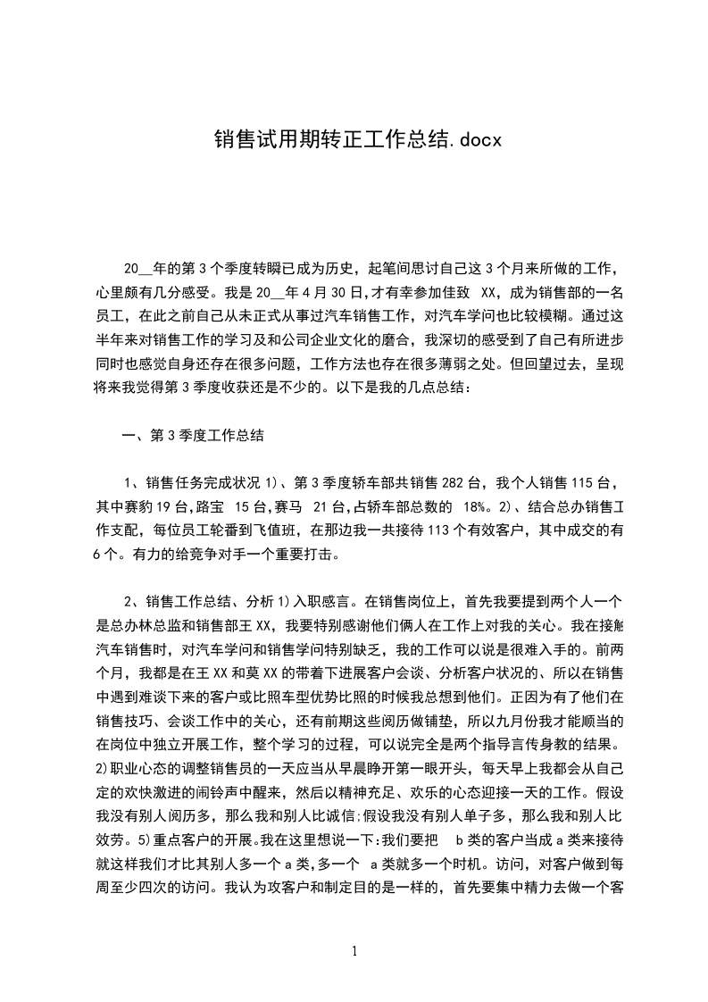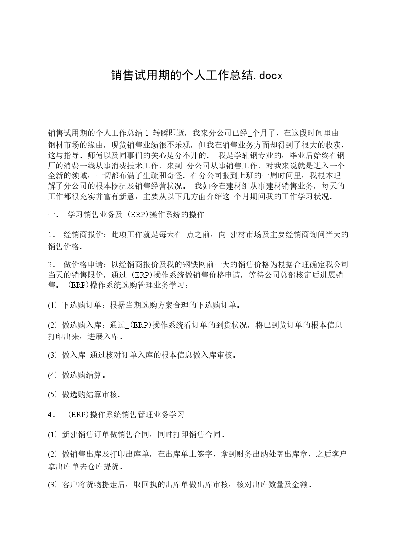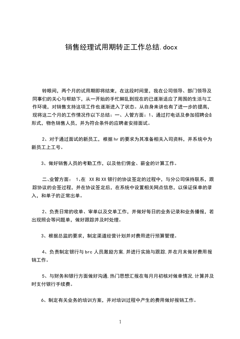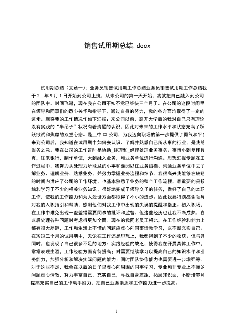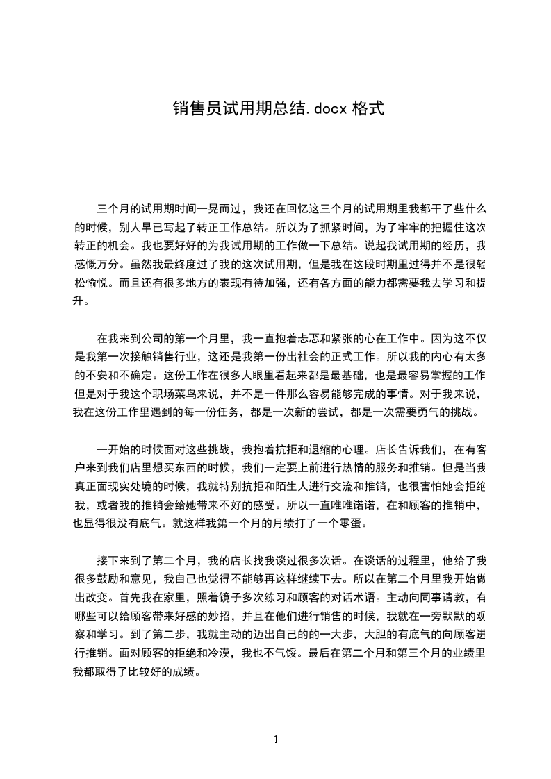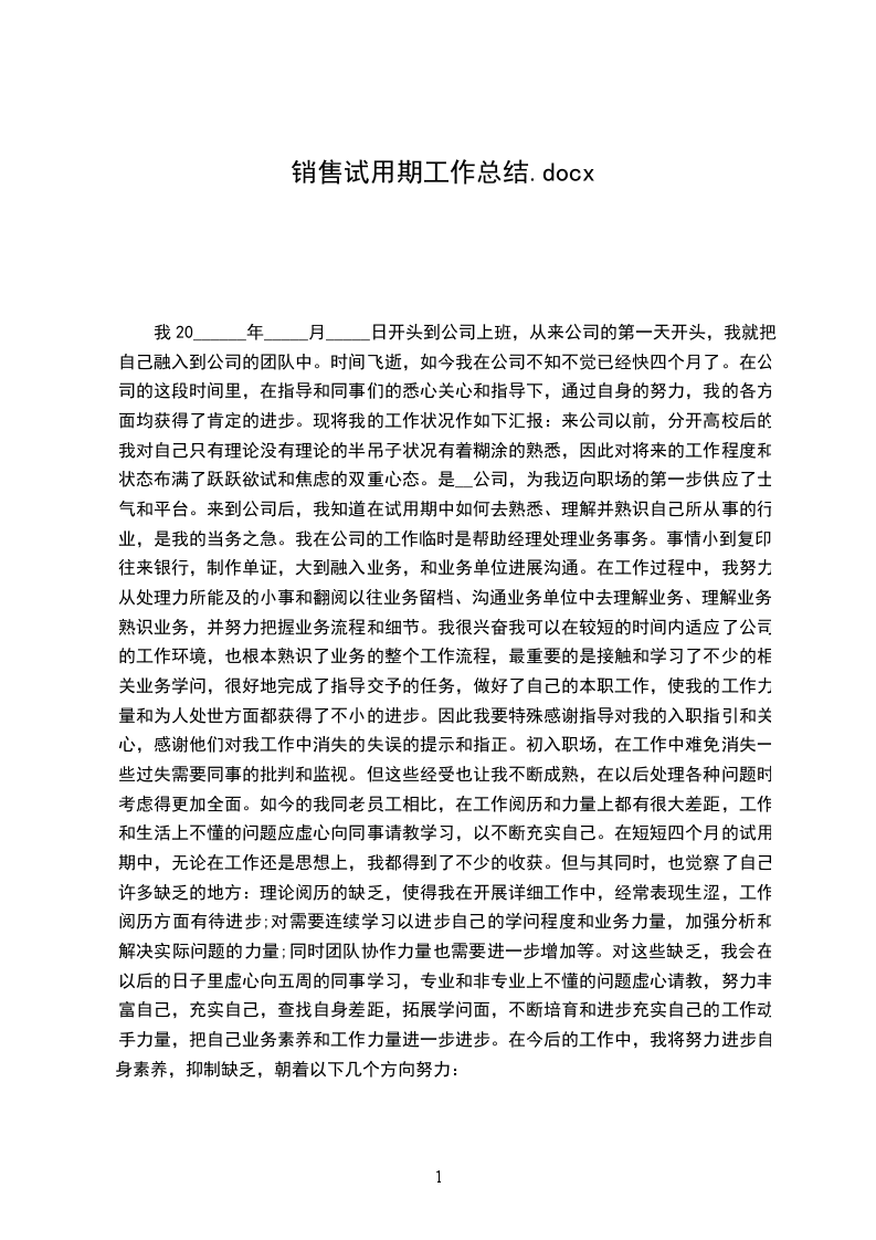 我20______年_____月_____日开头到公司上班,从来公司的第一天开头,我就把自己融入到公司的团队中。时间飞逝,如今我在公司不知不觉已经快四个月了。在公司的这段时间里,在指导和同事们的悉心关心和指导下,通过自身的努力,我的各方面均获得了肯定的进步。现将我的工作状况作如下汇报:来公司以前,分开高校后的我对自己只有理论没有理论的半吊子状况有着糊涂的熟悉,因此对将来的工作程度和状态布满了跃跃欲试和焦虑的双重心态。是__公司,为我迈向职场的第一步供应了士气和平台。来到公司后,我知道在试用期中如何去熟悉、理解并熟识自己所从事的行业,是我的当务之急。我在公司的工作临时是帮助经理处理业务事务。事情小到复印,往来银行,制作单证,大到融入业务,和业务单位进展沟通。在工作过程中,我努力从处理力所能及的小事和翻阅以往业务留档、沟通业务单位中去理解业务、理解业务、熟识业务,并努力把握业务流程和细节。我很兴奋我可以在较短的时间内适应了公司的工作环境,也根本熟识了业务的整个工作流程,最重要的是接触和学习了不少的相关业务学问,很好地完成了指导交予的任务,做好了自己的本职工作,使我的工作力量和为人处世方面都获得了不小的进步。因此我要特殊感谢指导对我的入职指引和关心,感谢他们对我工作中消失的失误的提示和指正。初入职场,在工作中难免消失一些过失需要同事的批判和监视。但这些经受也让我不断成熟,在以后处理各种问题时考虑得更加全面。如今的我同老员工相比,在工作阅历和力量上都有很大差距,工作和生活上不懂的问题应虚心向同事请教学习,以不断充实自己。在短短四个月的试用期中,无论在工作还是思想上,我都得到了不少的收获。但与其同时,也觉察了自己许多缺乏的地方:理论阅历的缺乏,使得我在开展详细工作中,经常表现生涩,工作阅历方面有待进步;对需要连续学习以进步自己的学问程度和业务力量,加强分析和解决实际问题的力量;同时团队协作力量也需要进一步增加等。对这些缺乏,我会在以后的日子里虚心向五周的同事学习,专业和非专业上不懂的问题虚心请教,努力丰富自己,充实自己,查找自身差距,拓展学问面,不断培育和进步充实自己的工作动手力量,把自己业务素养和工作力量进一步进步。在今后的工作中,我将努力进步自身素养,抑制缺乏,朝着以下几个方向努力: