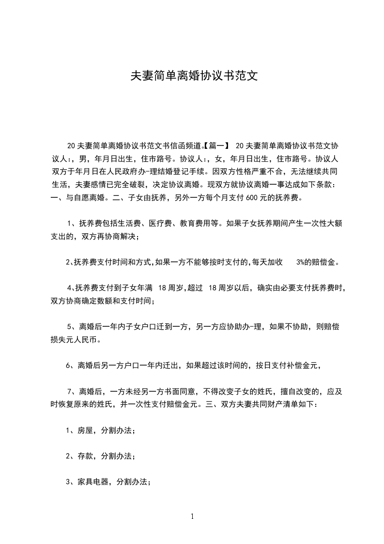 20夫妻简单离婚协议书范文书信函频道。【篇一】20夫妻简单离婚协议书范文协议人:,男,年月日出生,住市路号。协议人:,女,年月日出生,住市路号。协议人、双方于年月日在人民政府办-理结婚登记手续。因双方性格严重不合,无法继续共同生活,夫妻感情已完全破裂,决定协议离婚。现双方就协议离婚一事达成如下条款:一、与自愿离婚。二、子女由抚养,另外一方每个月支付600元的抚养费。
