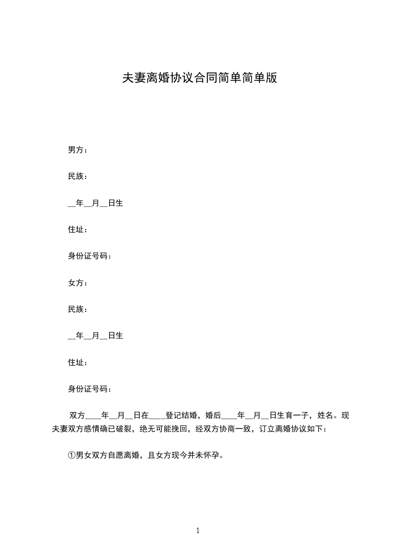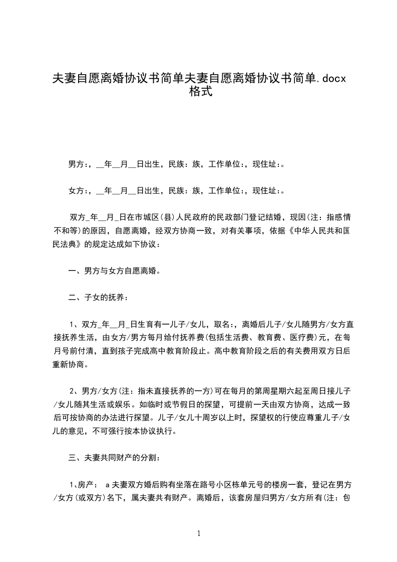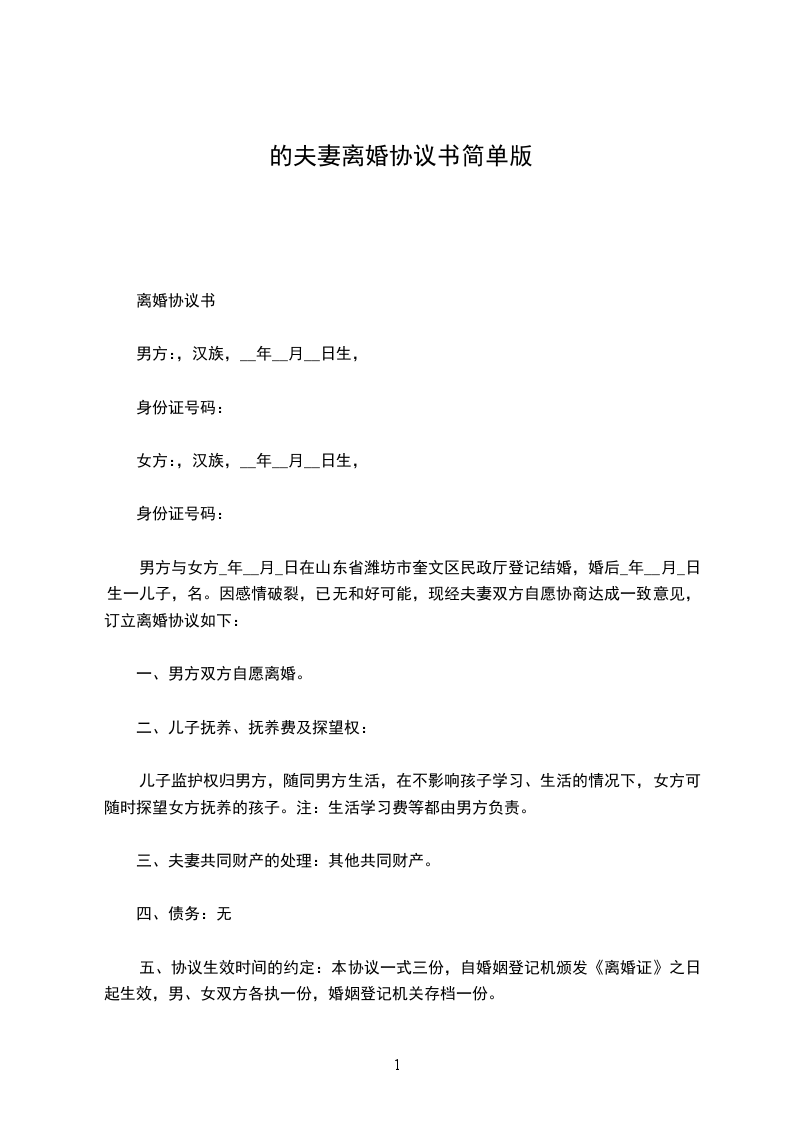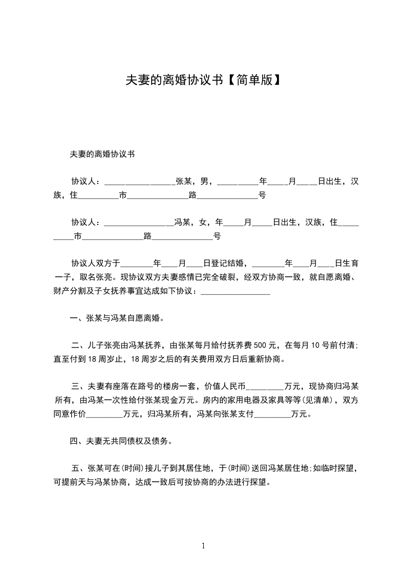 4、爷爷、奶奶探望权的行使;六、其他问题约定:七、本离婚协议一式叁份,双方各执一份,婚姻登记机关存档一份,在双方签字,并经婚姻登记机关办-理相应手续后生效。协议人:协议人:签订日期:年月日签订日期:年月日【篇二】20夫妻简单离婚协议书范文甲方:,男,年月日出生,现住身份证号码:乙方:,女,年月日出生,现住身份证号码:甲、乙双方于年月日在民政局(婚姻登记所)登记结婚,现因,双方感情却已破裂,无法继续共同生活且没有和好可能,故双方向婚姻登记机关申请离婚。经双方充分协商后,就财产分割及子女抚养问题自愿达成协议如下:一、位于的房产(建筑面积:平方米)是甲方婚前购买,离婚后归甲方所有,房产内全部家电、家私也归甲方所有。乙方自离婚登记之日起一周内搬出。二、甲、乙双方的婚生子女归甲方抚养,乙方每月给生活、教育费元,直至有独立生活能力为止。三、甲、乙双方夫妻关系存续期间,有银行存款,公司股票(价值),离婚后全部归乙方所有。四、甲、乙双方夫妻关系存续期间,有元人民币的欠款,离婚后该债务全部由乙方负责清偿。五、本离婚协议书一式叁份,甲、乙双方,婚姻登记机关各持一份,具有同等法律效力,自婚姻登记机关颁发离婚证之日起生效。六、夫妻无共同债权及债务。七、儿子由女方抚养,由男方每月给付抚养费(包括生活费、教育费、医疗费)元,在每月号前付清,直到孩子完成高中教育阶段止。高中教育阶段之后的有关费用双方日后重新协商。八、可在每月的第一个星期六早上八点接儿子到其居住地,于星期日早上九点送回居住地。如临时或春节探望,可提前一天与协商,达成一致后可按协商的办法进行探望。本协议一式叁份,双方各执一份,婚姻登记机关存档一份,在双方签字,并经婚姻登记机关办理相应手续后生效。男方签字:女方签字:年月日年月日【篇三】20夫妻简单离婚协议书范文男方:,汉族,年月日生,住,身份证号码:。女方:,汉族,年月日生,住,身份证号码:。风险提示:双方信息信息切记不可填错!这是确定离婚双方在法律角度上的身份特征,确保离婚协议订立当事人的性。若是信息有误差,可能导致协议直接无法生效。男方与女方于年月认识,于年月日在登记结婚,婚后于年月日生育一儿子/女儿,名,因致使夫妻感情破裂,已无和好可能,现经夫妻双方自愿协商达成一致意见,订立离婚协议如下:一、男女双方自愿离婚。二、子女抚养、抚养费及探望权:风险提示:抚养费的约定一般而言,无特殊情况(例如孩子丧失或部分丧失劳动能力)离婚协议对抚养费的约定是给付到孩子18周岁或独立生活为止。但在现实情况中,上大学甚至大学毕业后仍不能完全独立生活的孩子很普遍。如果你们对抚养期限没有约定,则默认抚养费支付至高中教育完毕;在你们对抚养期限有明确约定的情况下,适用你们的约定。比如,你们约定支付抚养费至孩子大学毕业止,若一方在孩子上大学后拒不履行,孩子有权根据离婚协议向其主张抚养费用。儿子/女儿由女方抚养,随同女方生活,抚养费(含托养费、教育费、医疗费)由男方全部负责,男方每月支付抚养费元,男方应于每月的1-5日前将儿子/女儿的抚养费交到女方手中或指定的银行帐号:)。风险提示:探视权的约定在离婚协议中,探视权往往不被当事人所重视,只是在离婚协议中简单写上孩子归某方抚养,对于探视的时间、地点、方式有明确约定的不多,导致离婚后一旦产生争议,还要再次通过法院确认,增加了当事人的经济成本和时间成本。因此,你必须十分重视离婚协议中关于子女探视权的相关规定,并作出明确约定,要强调细节。在不影响孩子学习、生活的情况下,男方每星期休息日可探望儿子/女儿一次或带儿子/女儿外出游玩,但应提前通知女方,女方应保证男方每周探望的时间不少于一天。三、夫妻共同财产的处理:风险提示:财产分割的约定如果担心对方还有你不知道的存款,不建议简洁的约定“各自财产归各自所有”。因为,这样离婚后即使你又知道他还有银行存款,也很难要求分割,毕竟,你已经同意“离婚时各自名下的存款归各自所有”。建议你们在离婚协议中,将截止到离婚协议签订之时,双方名下的银行存款情况详细列出,包括开户行、开户名、账号、存款余额、币种等。这样,离婚后一方若发现另一方没有记载在离婚协议上的存款,便可以通过诉讼形式要求分割甚至要求故意隐匿一方予以少分甚至不分。