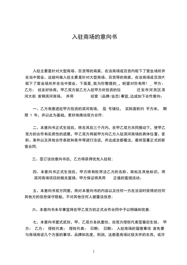 一、乙方有意进驻甲方投资的滨河商场, 层 号铺位, 实际面积约 平方米, 期限 1 年,并以此为基础,更好地推动双方合作;