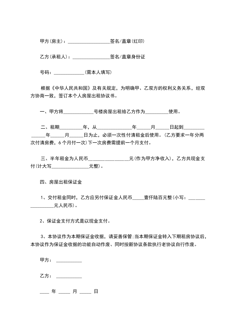 三、半年租金为人民币_________________元(作为甲方净收入),乙方共现金支付(计大写________________元整)。
