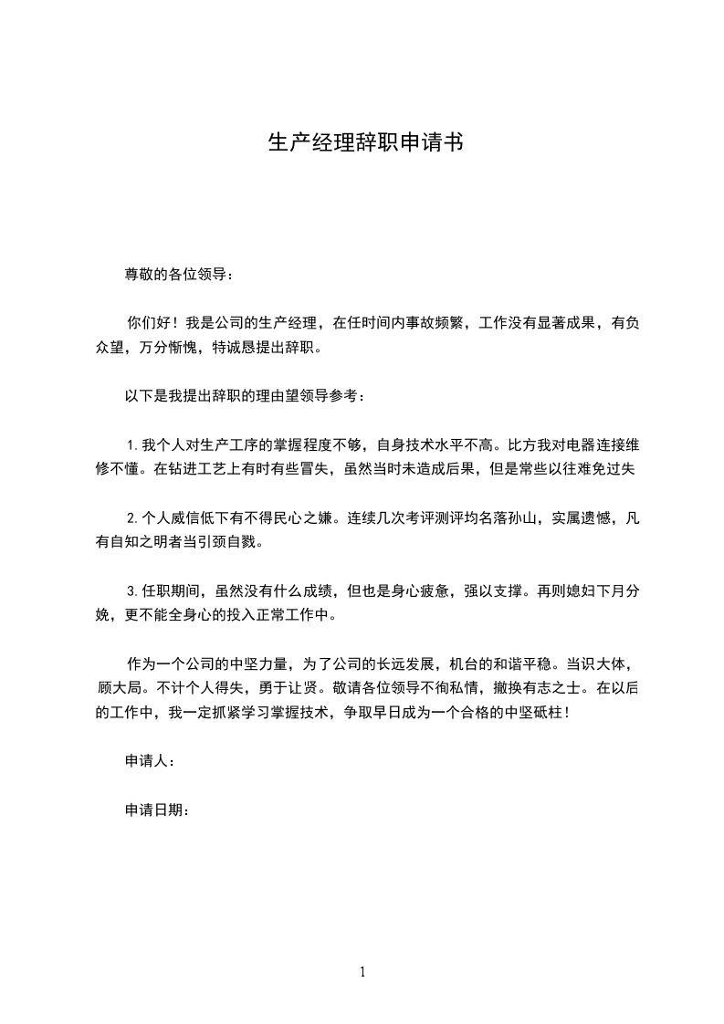 你们好!我是公司的生产经理,在任时间内事故频繁,工作没有显著成果,有负众望,万分惭愧,特诚恳提出辞职。