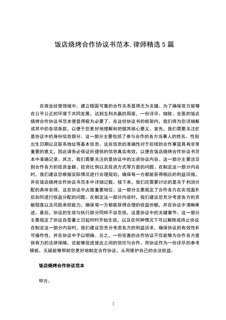 甲乙双方经友好协商,在平等、互利的基础上,就乙方在甲方饭店经营烧烤事宜达成以下合作协议。