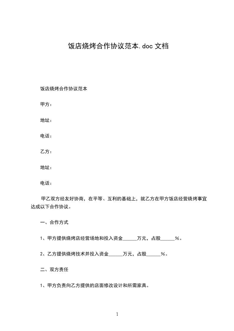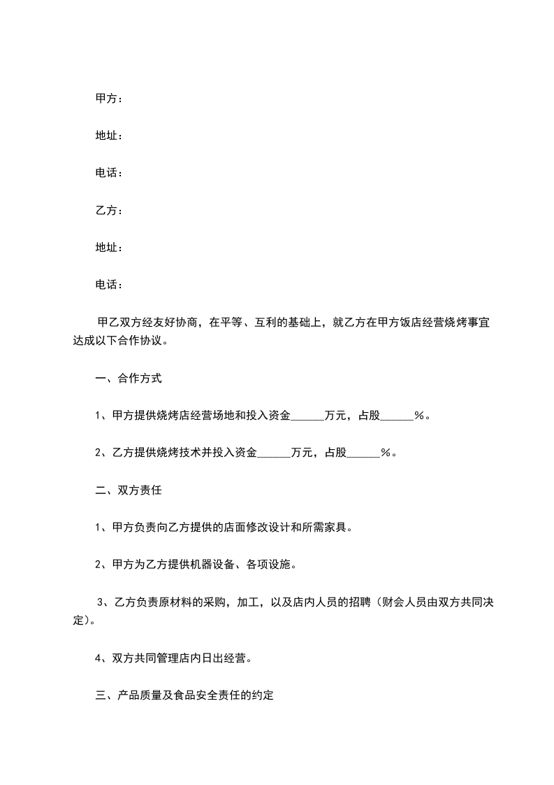 1、甲方提供烧烤店经营场地和投入资金______万元,占股______%。