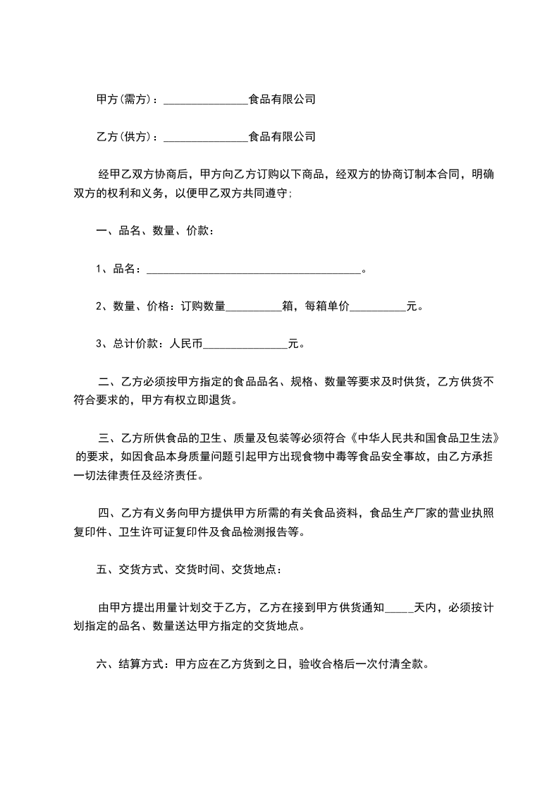 2.乙方为甲方提供的商品,应符合《食品卫生要求》和《产品质量标准》,如出现产品质量问题,甲方可退货,由乙方承担商品损失。
