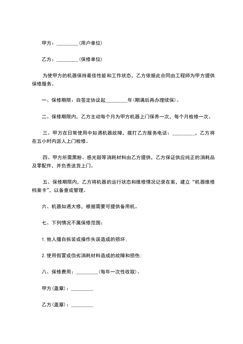 为了防止甲方因__________________设备维修保养不及时而导致不能正常工作造成的产财损失,乙方特此接受甲方委托。乙方为保证甲方设备的正常使用,对甲方的合同设备进行维修保养服务。为保护甲乙双方的合法权益,根据《中华人民共和国民法典》,甲乙双方遵循公平原则友好协商签订本合同。初次签合同前,设备应正常运转情况下,方可签订合同。合同内容如下: