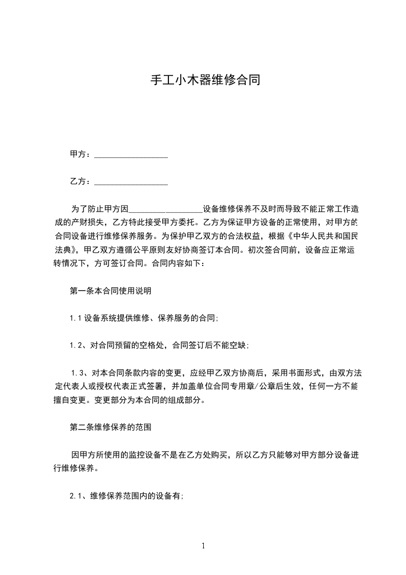 为了防止甲方因__________________设备维修保养不及时而导致不能正常工作造成的产财损失,乙方特此接受甲方委托。乙方为保证甲方设备的正常使用,对甲方的合同设备进行维修保养服务。为保护甲乙双方的合法权益,根据《中华人民共和国民法典》,甲乙双方遵循公平原则友好协商签订本合同。初次签合同前,设备应正常运转情况下,方可签订合同。合同内容如下: