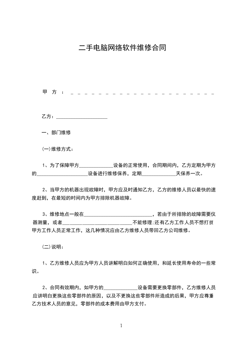 1、为了保障甲方______________设备的正常使用,合同期间内,乙方定期为甲方的_____________________设备进行维修保养,定期______________天保养一次。
