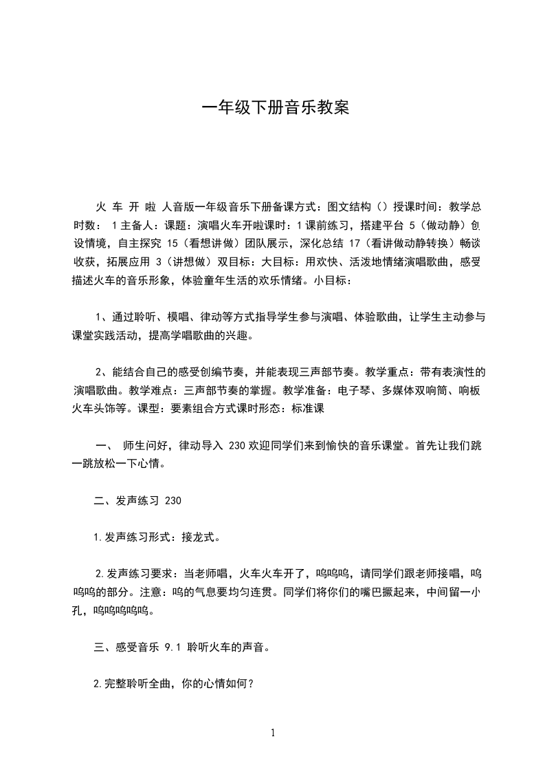 火 车 开 啦 人音版一年级音乐下册备课方式:图文结构()授课时间:教学总时数: 1主备人:课题:演唱火车开啦课时:1课前练习,搭建平台 5(做动静)创设情境,自主探究 15(看想讲做)团队展示,深化总结 17(看讲做动静转换)畅谈收获,拓展应用 3(讲想做)双目标:大目标:用欢快、活泼地情绪演唱歌曲,感受描述火车的音乐形象,体验童年生活的欢乐情绪。小目标: