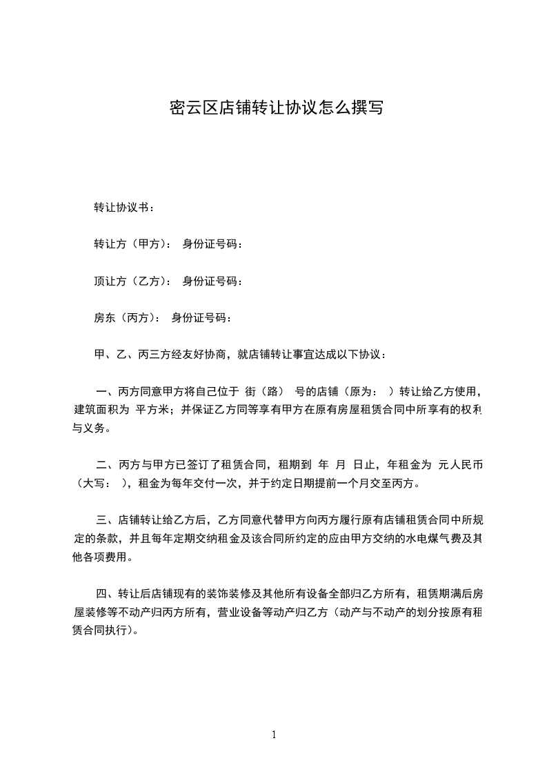 一、丙方同意甲方将自己位于 街(路) 号的店铺(原为: )转让给乙方使用,建筑面积为 平方米;并保证乙方同等享有甲方在原有房屋租赁合同中所享有的权利与义务。