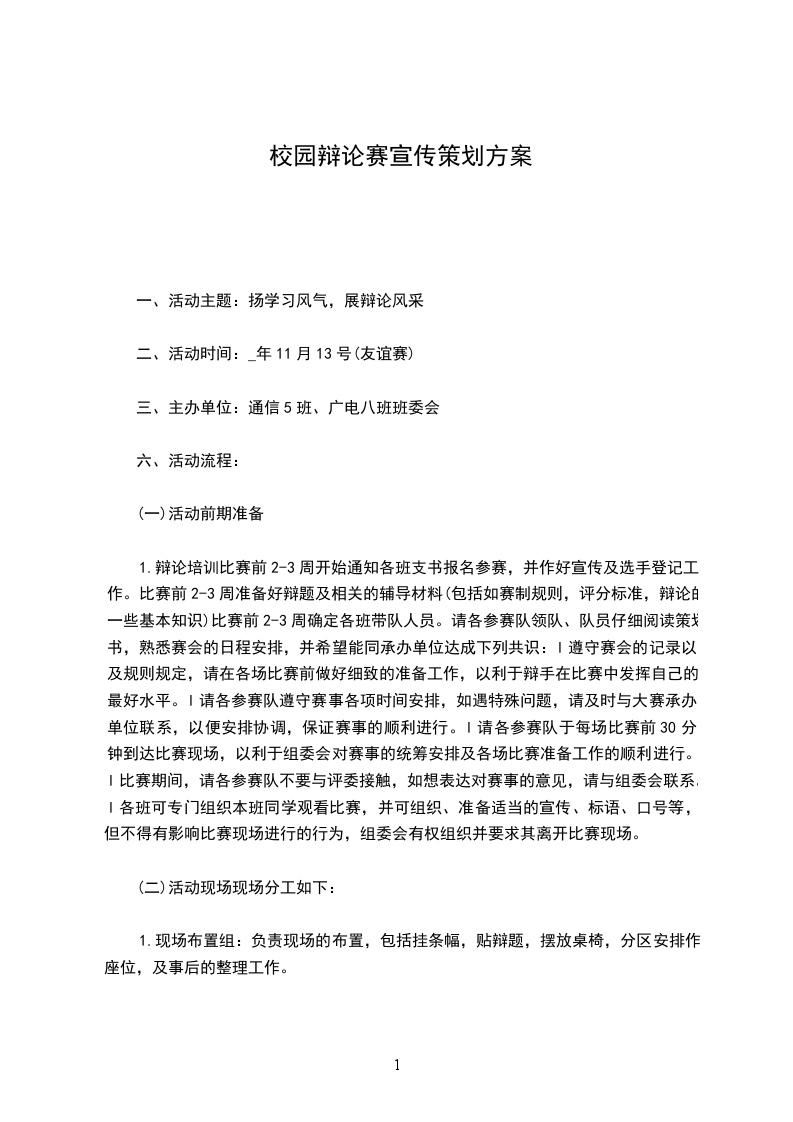 2.在学校的各种qq群微信公众号发布消息宣传内容:辩论赛主办方,比赛时间,地点,活动主题及辩题参赛须知1以班级为单位报名,每个队伍四名辩手,分为一辩,二辩,三辩,四辩,一到两名替补队员,每个班级可以出1支或2支队伍,选举一位队长,用来比分和比赛结果的确认工作。2比赛语言积极向上,无不良言论。活动流程主持人宣布比赛开始及介绍比赛规则和介绍评委及嘉宾比赛开始开篇立论