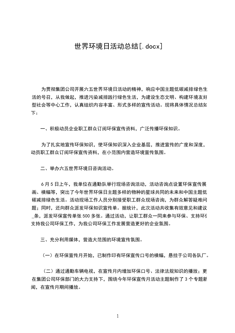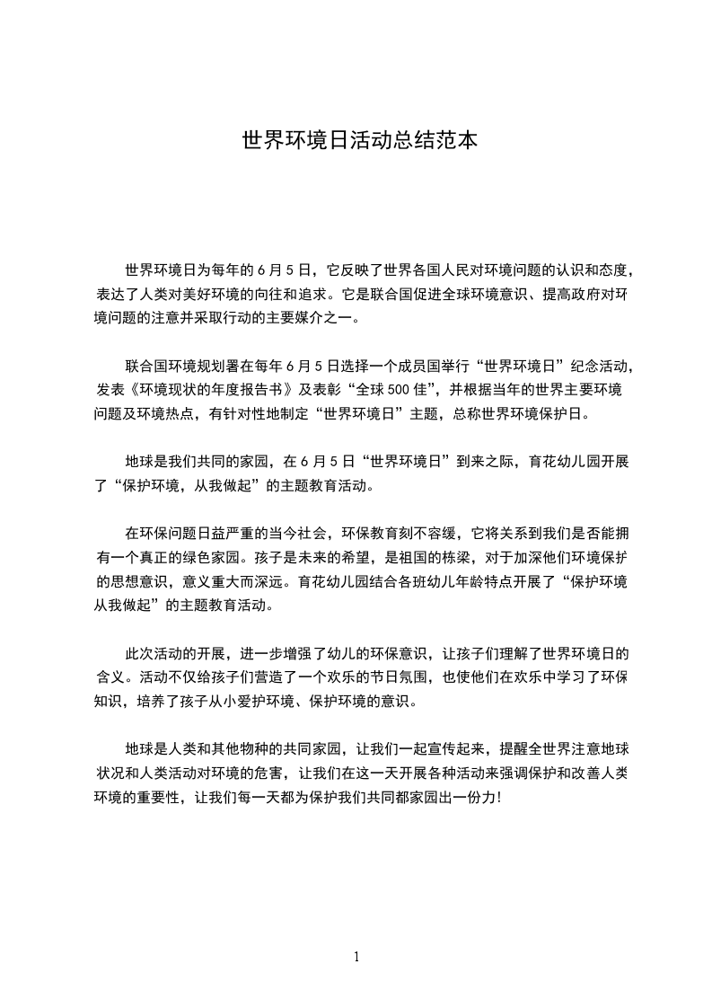 (2)活动目标1.知道6月5日是世界环境日,关注四周环境,增加环保意识。2.在成人指导下,能主动与不熟识的人交谈并送出自己制作的宣扬卡,培育勇敢精神,体验与人交往乐趣。活动预备有关环境爱惜的图片、纸、彩笔等。活动过程1.6月5日“世界环境日”的来历。老师:“我们四周的环境怎么样呢”可重点从空气、水、树木、动物等方面引导幼儿回答。提问:6月1日儿童节,那么6月5日是一个什么节日为什么世界上要确定这样一个节日1972年6月5日联合国召开了有113个国家参加的“联合国人类环境会议”,会上提出了“只有一个地球”的口号,争辩了爱惜全世界环境的行动方案,为了纪念大会的召开,当年联合国做出决议,把6月5日定为“世界环境日”。“世界环境日”主要是让全世界人民都来留意爱惜我们人类必需生存的环境。2.“世界环境日”的主题。老师:“每年世界环境日的主题都不一样,1984年是沙漠化,1992年是只有一个地球一齐关怀、共同共享,20年是水20生命之所系。”老师讲解今年世界环境日的主题。3.老师提问、幼儿争辩。老师:“在环境日到来的这段时间我们可以做哪些事呢”幼儿争辩。可建议幼儿为环境爱惜做一件事,如一人拣一袋垃圾、种一盆花或节约水、粮食等。老师出示环境爱惜宣扬画、警示画并讲解内容。老师:“小伴侣看到有哪些破坏环境的行为呢”“怎样使大家都行动起来爱惜环境呢”幼儿争辩。只有全社会每个人都行动起来爱惜环境,那些破坏和污染环境的行为才可能被杜绝。老师:“有的人不知道这一节日、不知道怎么爱惜环境。”鼓舞幼儿想出不同的方法,引发动手制作宣扬卡的欲望。4.争辩如何制作宣扬卡引导幼儿从方法、材料方面来谈。(写上要说的话,画出被污染、破坏的环境,把6月5日世界环境日写上。老师也可打印成彩条让幼儿贴上等)。5.幼儿制作宣扬卡,老师巡回指导、关怀。环境爱惜的内容要突出,画面支配要合理,在四周、两边或角上适当加一些装饰。6.分发宣扬单。老师告知幼儿平安及留意事项,带他们到幼儿园最近的社区街道、车少并有人行道的地方,鼓舞幼儿先向见到的爷爷、奶奶、阿姨、哥哥、姐姐问好,然后告知他们今日是世界环境日,最终把宣扬卡送给他们。(老师可依据班级状况分组带幼儿外出,可增加助手以确保平安)。7.讲评活动。