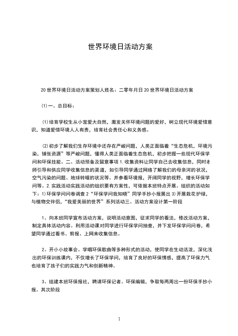 20世界环境日活动方案策划人姓名:二零年月日20世界环境日活动方案