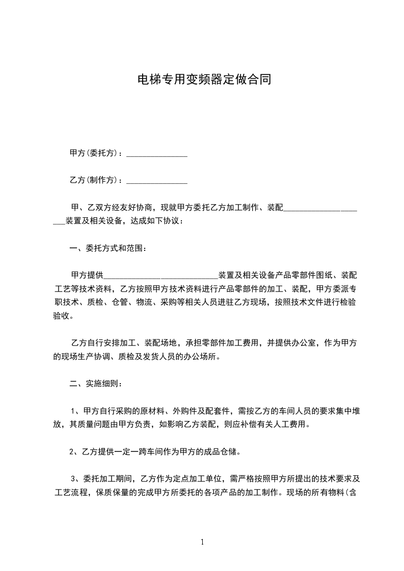 1、甲方自行采购的原材料、外购件及配套件,需按乙方的车间人员的要求集中堆放,其质量问题由甲方负责,如影响乙方装配,则应补偿有关人工费用。