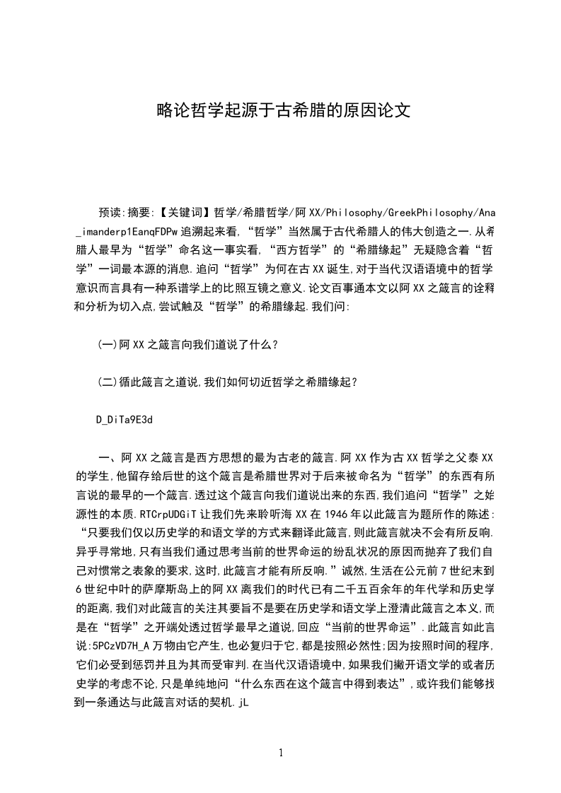 预读:摘要:【关键词】哲学/希腊哲学/阿XX/Philosophy/GreekPhilosophy/Ana_imanderp1EanqFDPw追溯起来看,“哲学”当然属于古代希腊人的伟大创造之一.从希腊人最早为“哲学”命名这一事实看,“西方哲学”的“希腊缘起”无疑隐含着“哲学”一词最本源的消息.追问“哲学”为何在古XX诞生,对于当代汉语语境中的哲学意识而言具有一种系谱学上的比照互镜之意义.论文百事通本文以阿XX之箴言的诠释和分析为切入点,尝试触及“哲学”的希腊缘起.我们问: