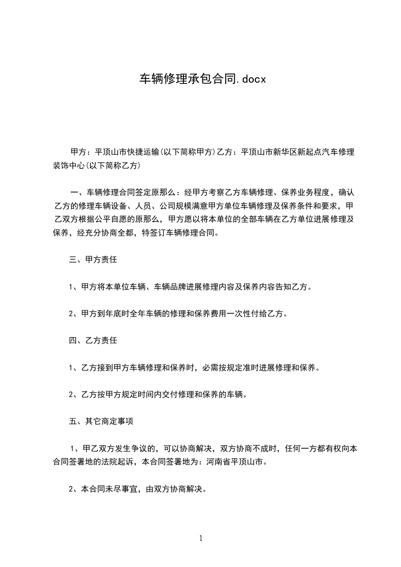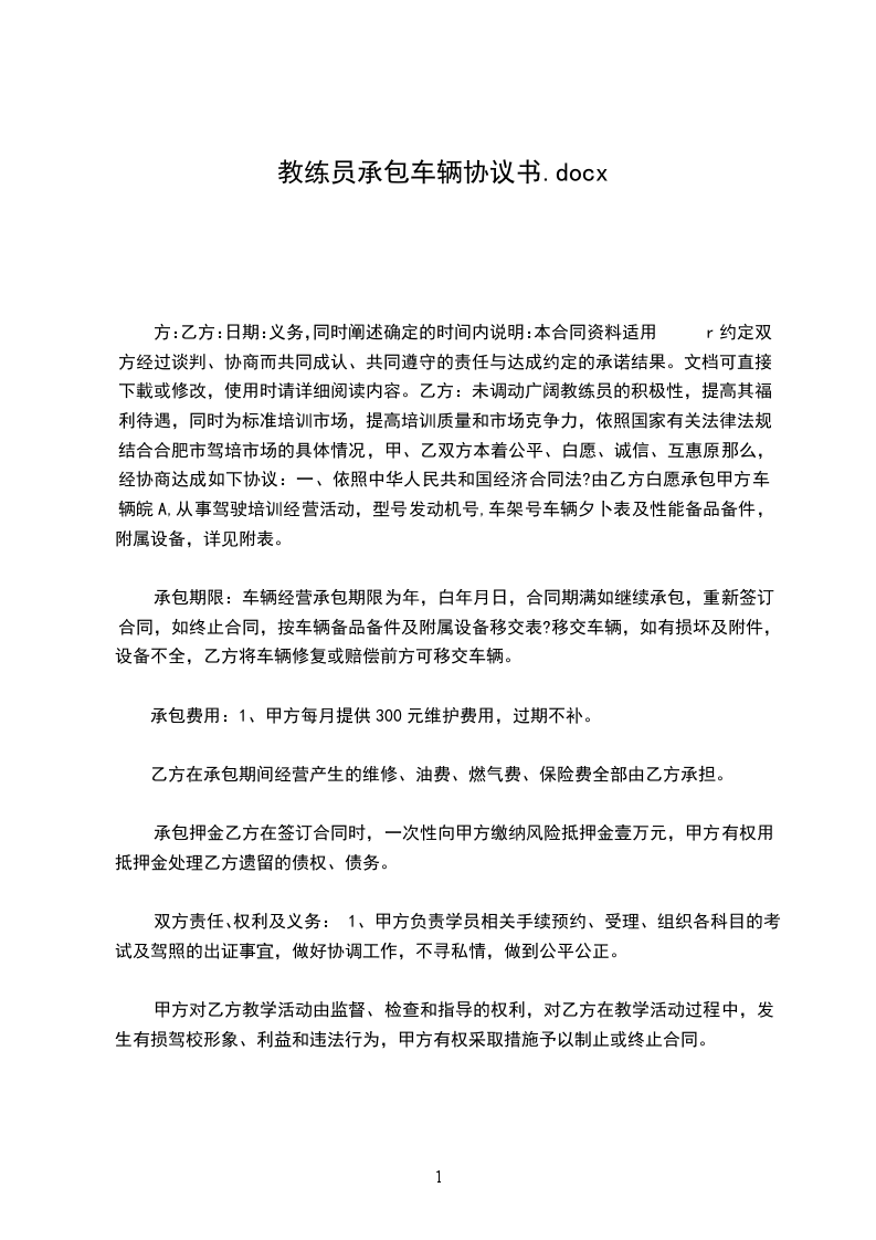 5 甲方:甘州区金牛农机效劳协会 法人代表:张俊民 联络 : 乙方: 身份证号: 家庭住址: 联络 : 为进一步加强车辆管理,努力进步机车作业质量和经营效益,实现风险共担、利益共享,充分调动驾驶人员干事创业的乐观性和主动性,经甲乙双方协商,就20xx年协会车辆承包经营事项达成协议,签订如下合同内容: