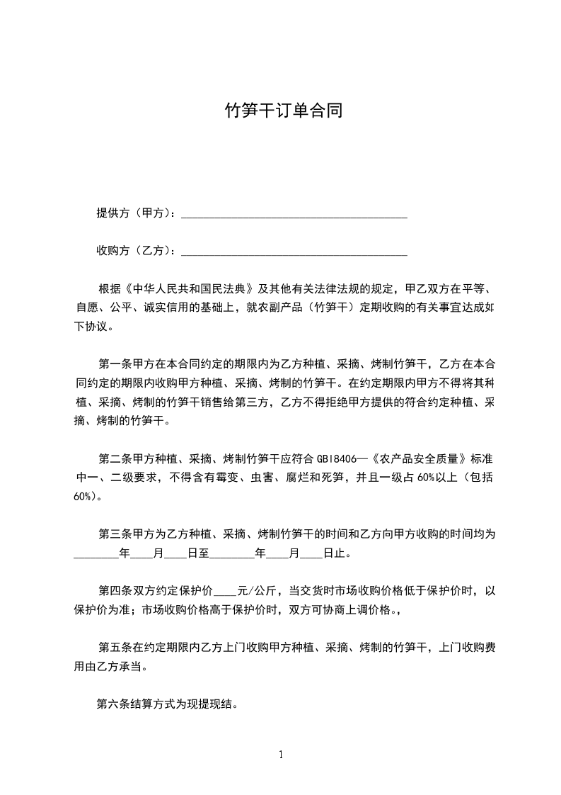 根据《中华人民共和国民法典》及其他有关法律法规的规定,甲乙双方在平等、自愿、公平、诚实信用的基础上,就农副产品(竹笋干)定期收购的有关事宜达成如下协议。