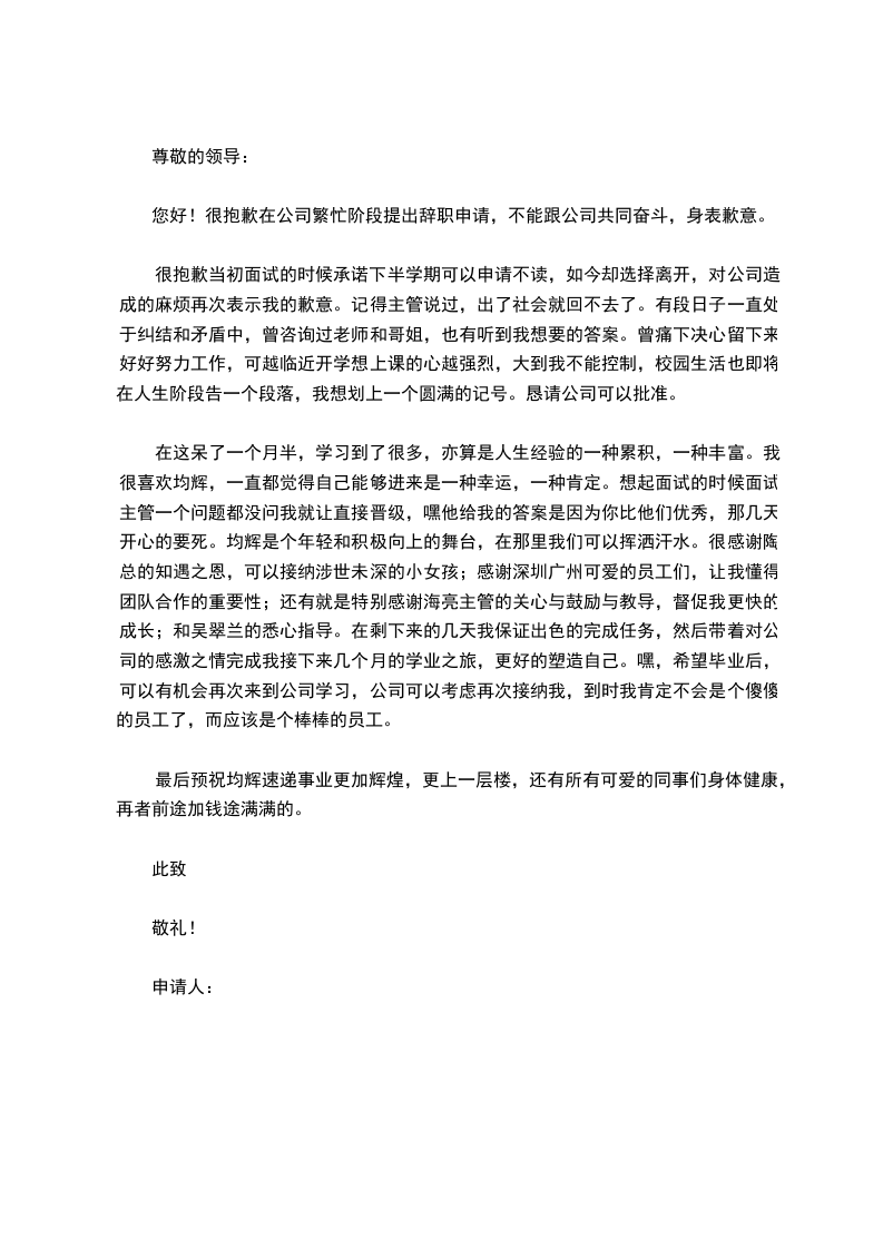 很抱歉当初面试的时候承诺下半学期可以申请不读,如今却选择离开,对公司造成的麻烦再次表示我的歉意。记得主管说过,出了社会就回不去了。有段日子一直处于纠结和矛盾中,曾咨询过老师和哥姐,也有听到我想要的答案。曾痛下决心留下来好好努力工作,可越临近开学想上课的心越强烈,大到我不能控制,校园生活也即将在人生阶段告一个段落,我想划上一个圆满的记号。恳请公司可以批准。
