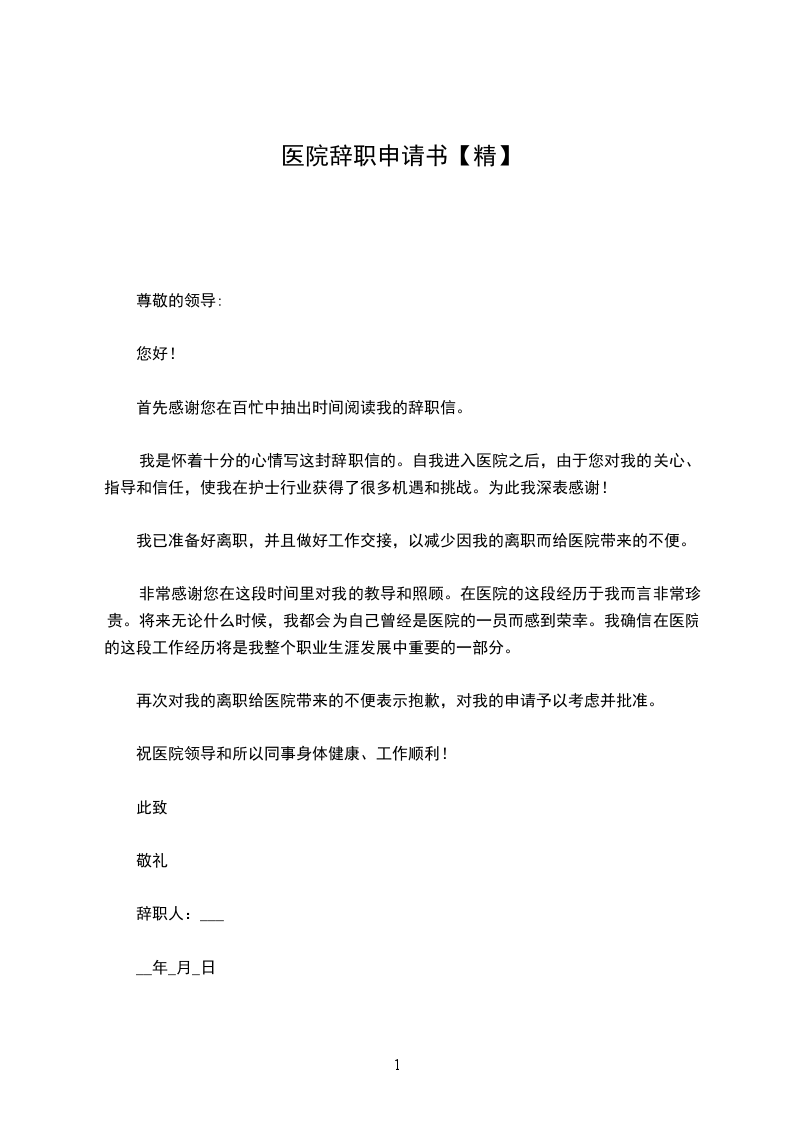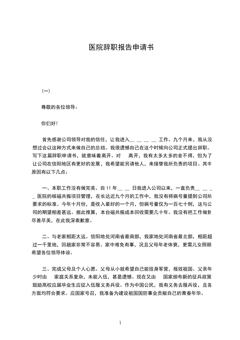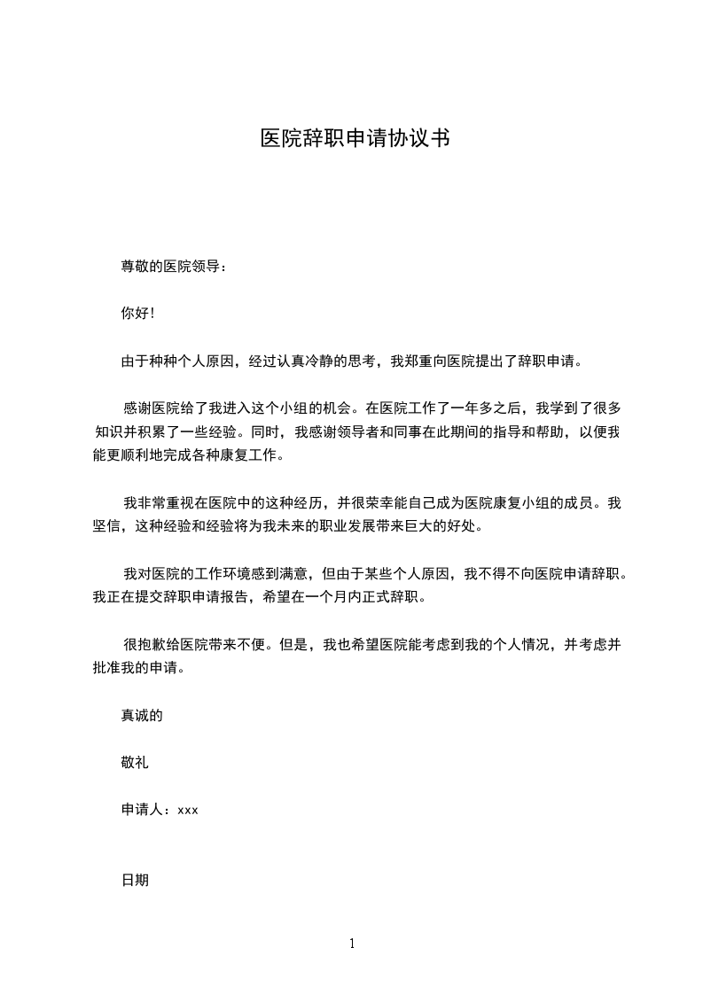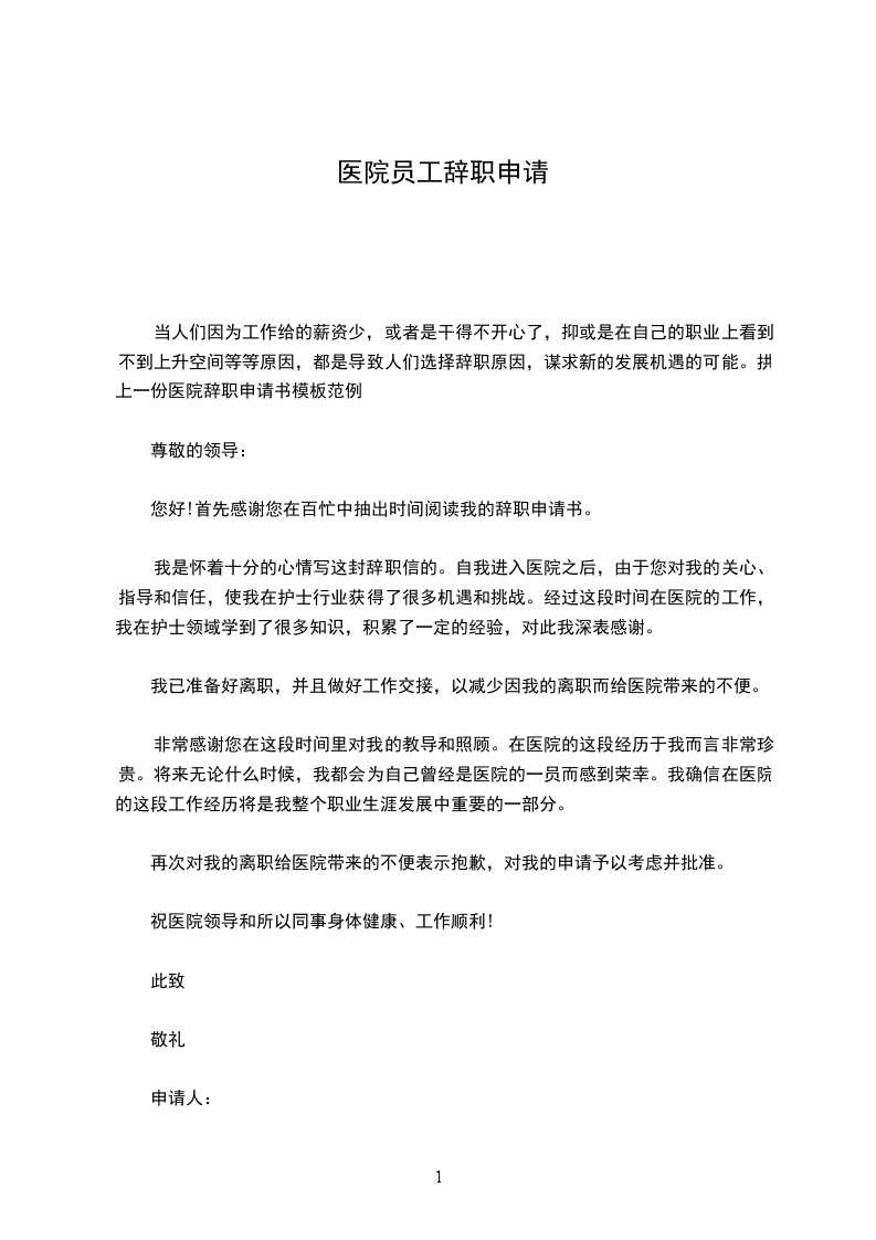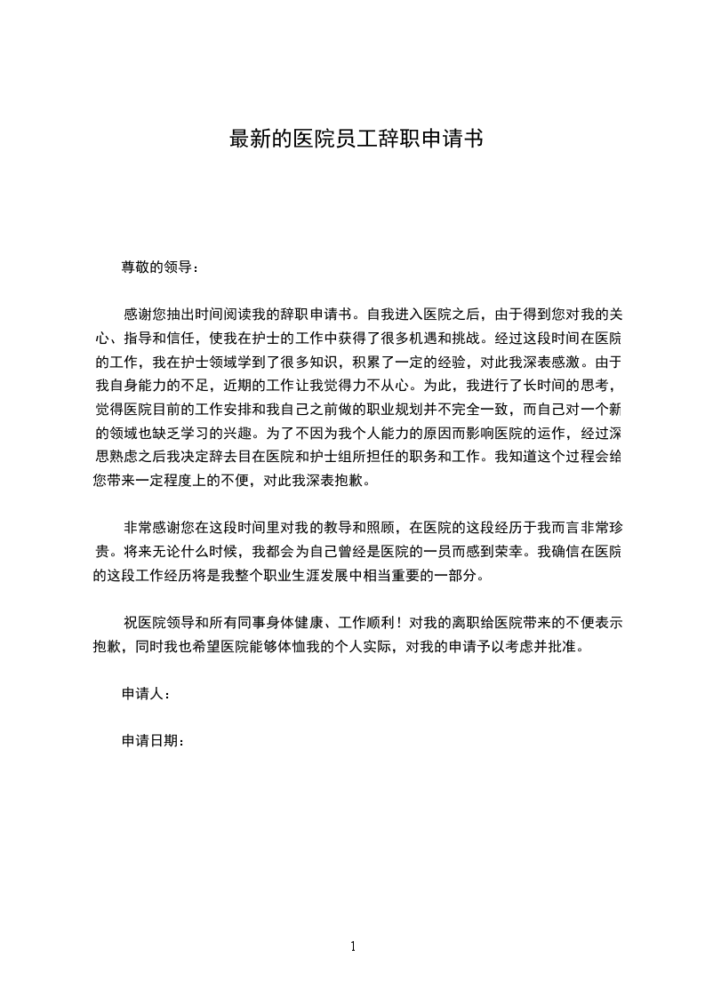 祝医院领导和所有同事身体健康、工作顺利!对我的离职给医院带来的不便表示抱歉,同时我也希望医院能够体恤我的个人实际,对我的申请予以考虑并批准。