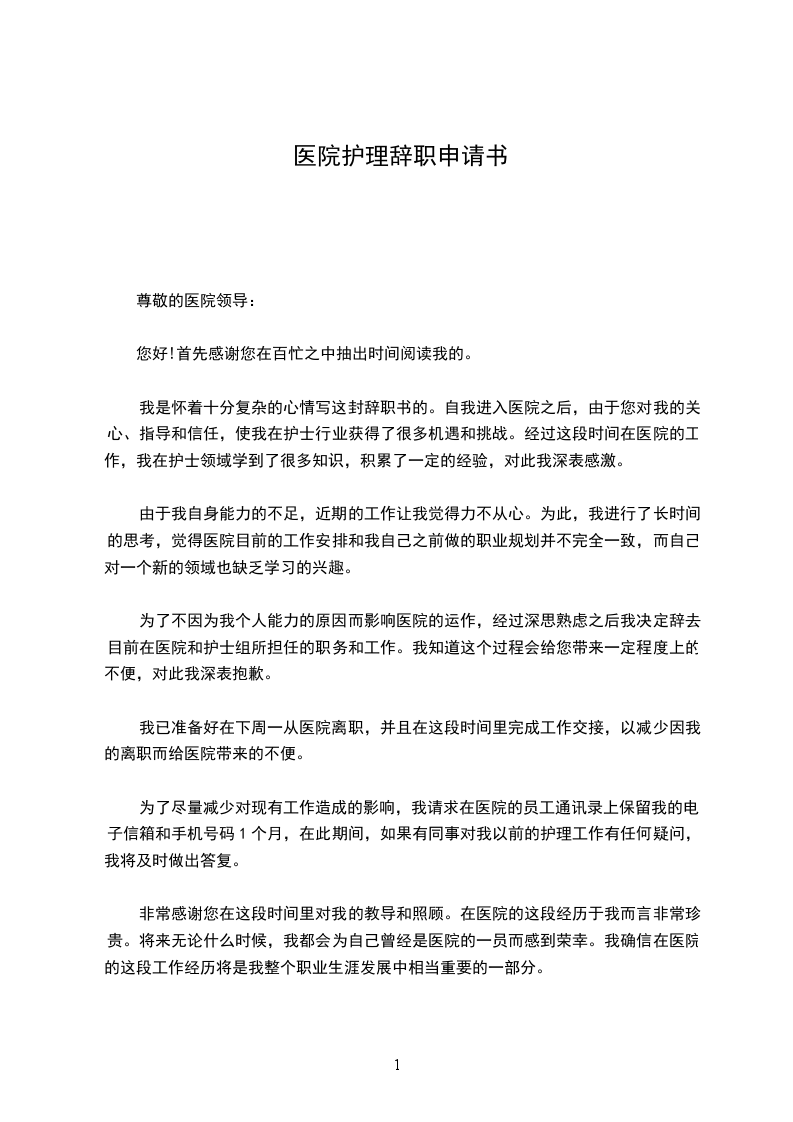 感谢您抽出时间阅读我的辞职申请书。自我进入医院之后,由于得到您对我的关心、指导和信任,使我在护士的工作中获得了很多机遇和挑战。经过这段时间在医院的工作,我在护士领域学到了很多知识,积累了一定的经验,对此我深表感激。由于我自身能力的不足,近期的工作让我觉得力不从心。为此,我进行了长时间的思考,觉得医院目前的工作安排和我自己之前做的职业规划并不完全一致,而自己对一个新的领域也缺乏学习的兴趣。为了不因为我个人能力的原因而影响医院的运作,经过深思熟虑之后我决定辞去目在医院和护士组所担任的职务和工作。我知道这个过程会给您带来一定程度上的不便,对此我深表抱歉。