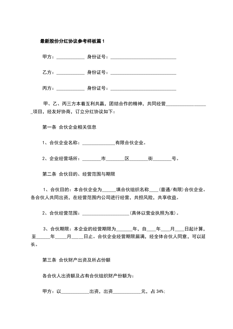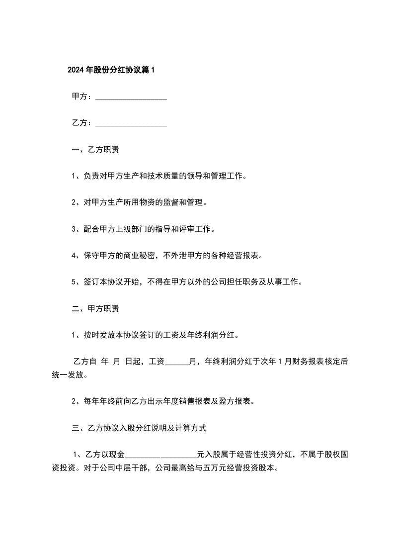 2024年股份分红协议参考样式篇1