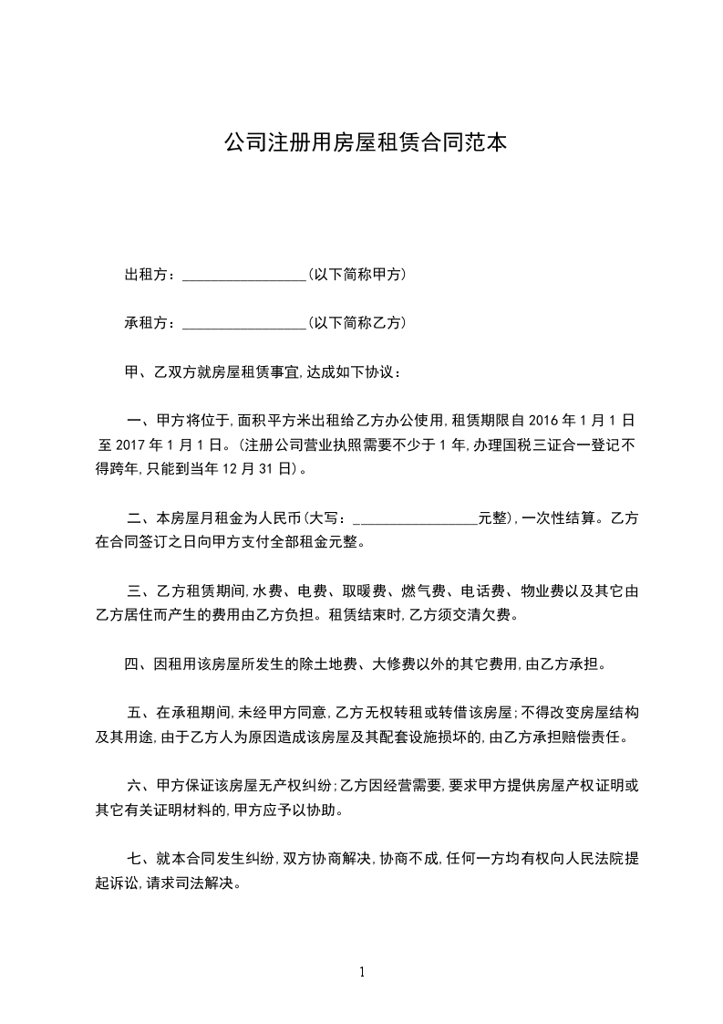 一、甲方将位于,面积平方米出租给乙方办公使用,租赁期限自2024年1月1日至2024年1月1日。(注册公司营业执照需要不少于1年,办理国税三证合一登记不得跨年,只能到当年12月31日)。