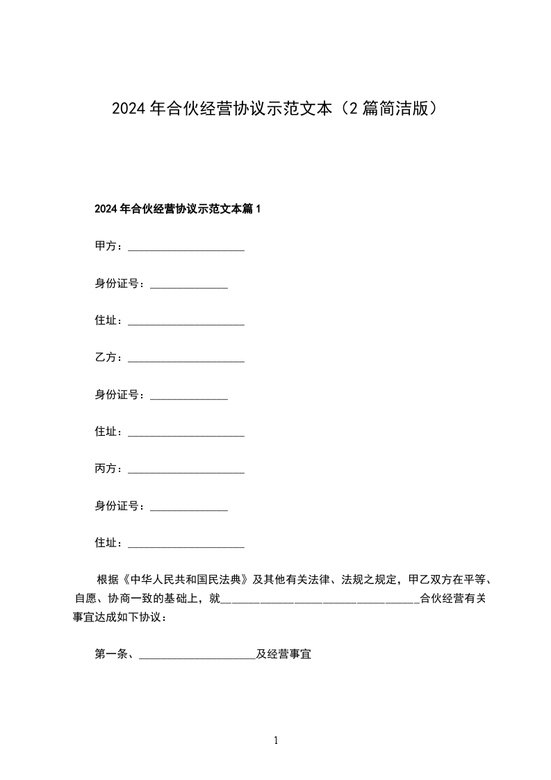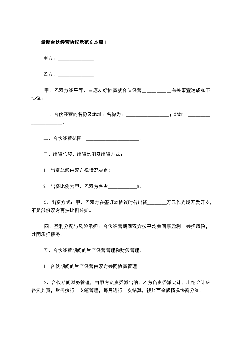 根据《中华人民共和国民法典》及其他有关法律、法规之规定,甲乙双方在平等、自愿、协商一致的基础上,就___________________________________合伙经营有关事宜达成如下协议: