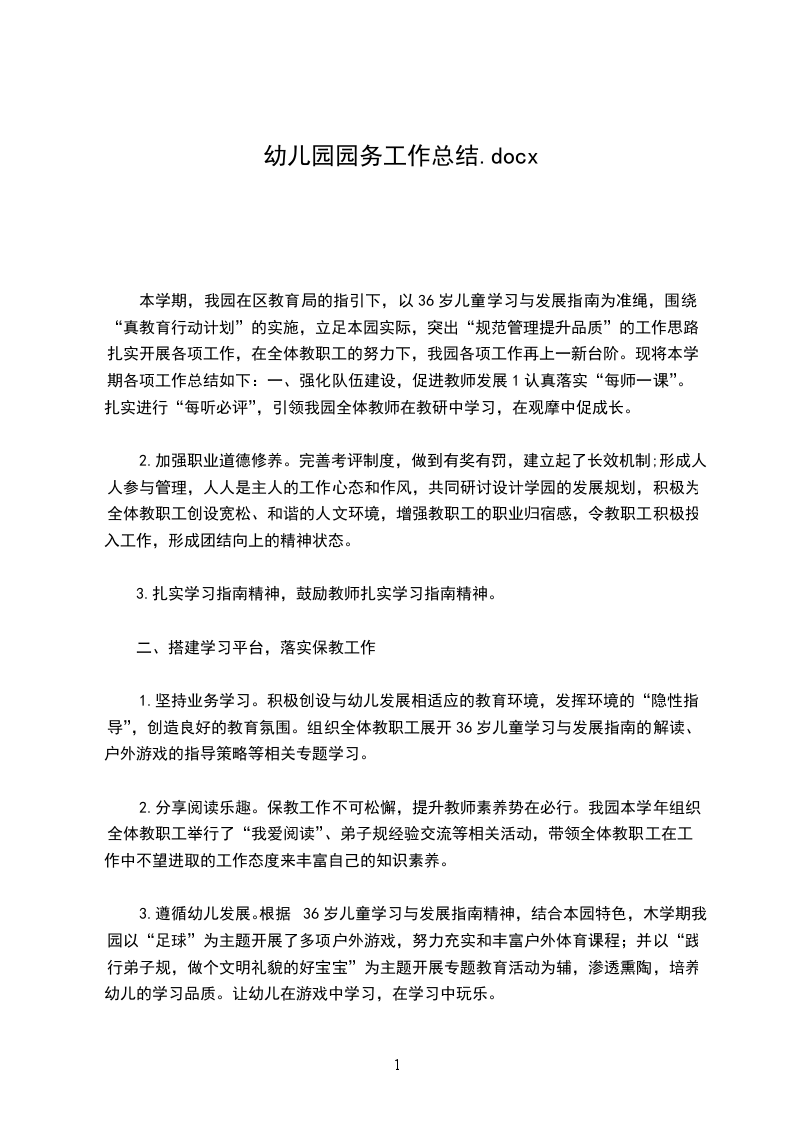 转瞬间,一个学期在劳碌而紧急的工作中不知不觉已悄然而逝。本学期,我园仔细执行纲要、指南,坚持贯彻党的训练方针,关注幼儿个体差异,促进幼儿富有共性的、主动的人格进展,为其打下良好根底。本学期在全园教职工的共同努力下,努力完成各项工作,获得肯定的进步和成果。现将幼儿园园务工作总结如下: