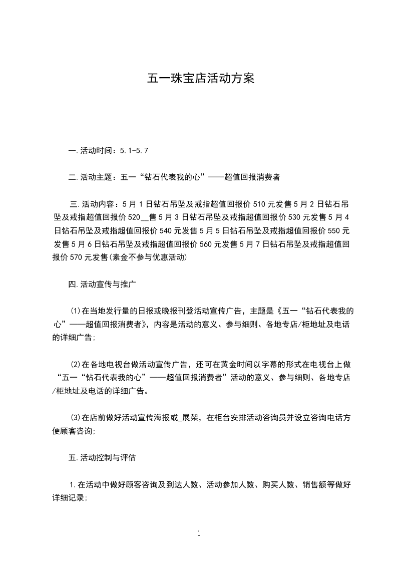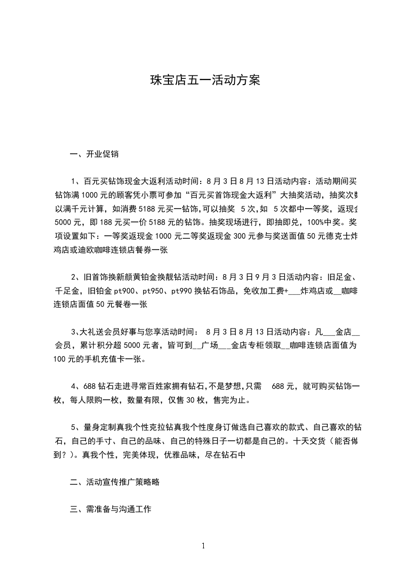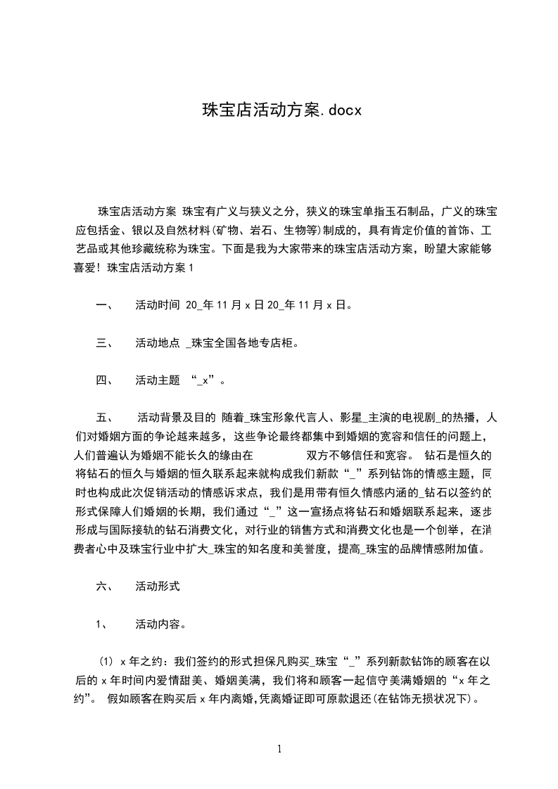 六、 活动时间和地点 活动时间:x月x号x月x号。 此次活动在_珠宝全部店面进行。 珠宝店活动方案3