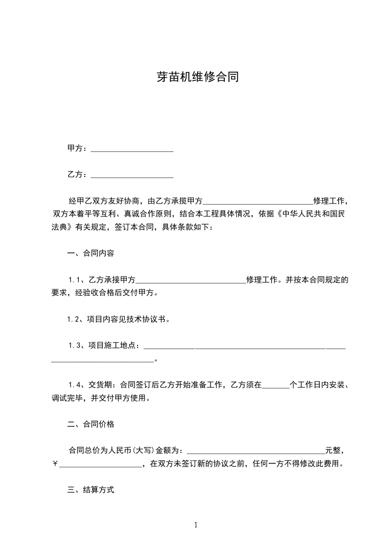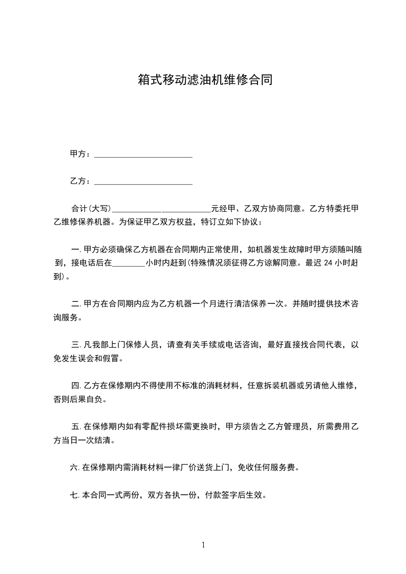 为了防止甲方因__________________设备维修保养不及时而导致不能正常工作造成的产财损失,乙方特此接受甲方委托。乙方为保证甲方设备的正常使用,对甲方的合同设备进行维修保养服务。为保护甲乙双方的合法权益,根据《中华人民共和国民法典》,甲乙双方遵循公平原则友好协商签订本合同。初次签合同前,设备应正常运转情况下,方可签订合同。合同内容如下: