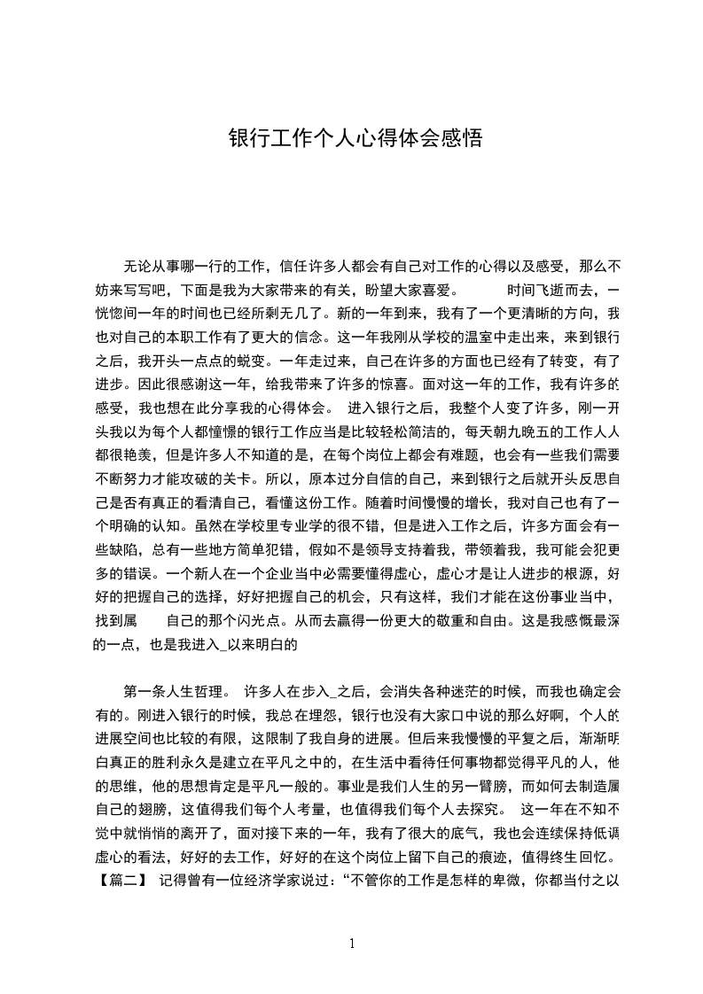 第一条人生哲理。 许多人在步入_之后,会消失各种迷茫的时候,而我也确定会有的。刚进入银行的时候,我总在埋怨,银行也没有大家口中说的那么好啊,个人的进展空间也比较的有限,这限制了我自身的进展。但后来我慢慢的平复之后,渐渐明白真正的胜利永久是建立在平凡之中的,在生活中看待任何事物都觉得平凡的人,他的思维,他的思想肯定是平凡一般的。事业是我们人生的另一臂膀,而如何去制造属 自己的翅膀,这值得我们每个人考量,也值得我们每个人去探究。 这一年在不知不觉中就悄悄的离开了,面对接下来的一年,我有了很大的底气,我也会连续保持低调虚心的看法,好好的去工作,好好的在这个岗位上留下自己的痕迹,值得终生回忆。 【篇二】 记得曾有一位经济学家说过:“不管你的工作是怎样的卑微,你都当付之以艺术家的精神,当有十二分热忱。这样你就会从平凡卑微的境况中解脱出来,不再有劳碌辛苦的感觉,你就能使你的工作成为乐趣,只有这样你才能真心实意地善待每一位客户。”银行的工作是简洁而平凡的,然而就在这日复一日,年复一年的迎来送往中我学会了以务实求真的看法对待工作,学会了以自然豁达宽容的心境对待平凡的工作岗位,领会到了服务的魅力,体会到了什么叫“以客户为中心”的真正内涵。 在平凡简洁的工作中,我渐渐明白了在小事、在微小之处用“心”去赢得客户这一道理。我曾遇到一位特别客户,那是一位