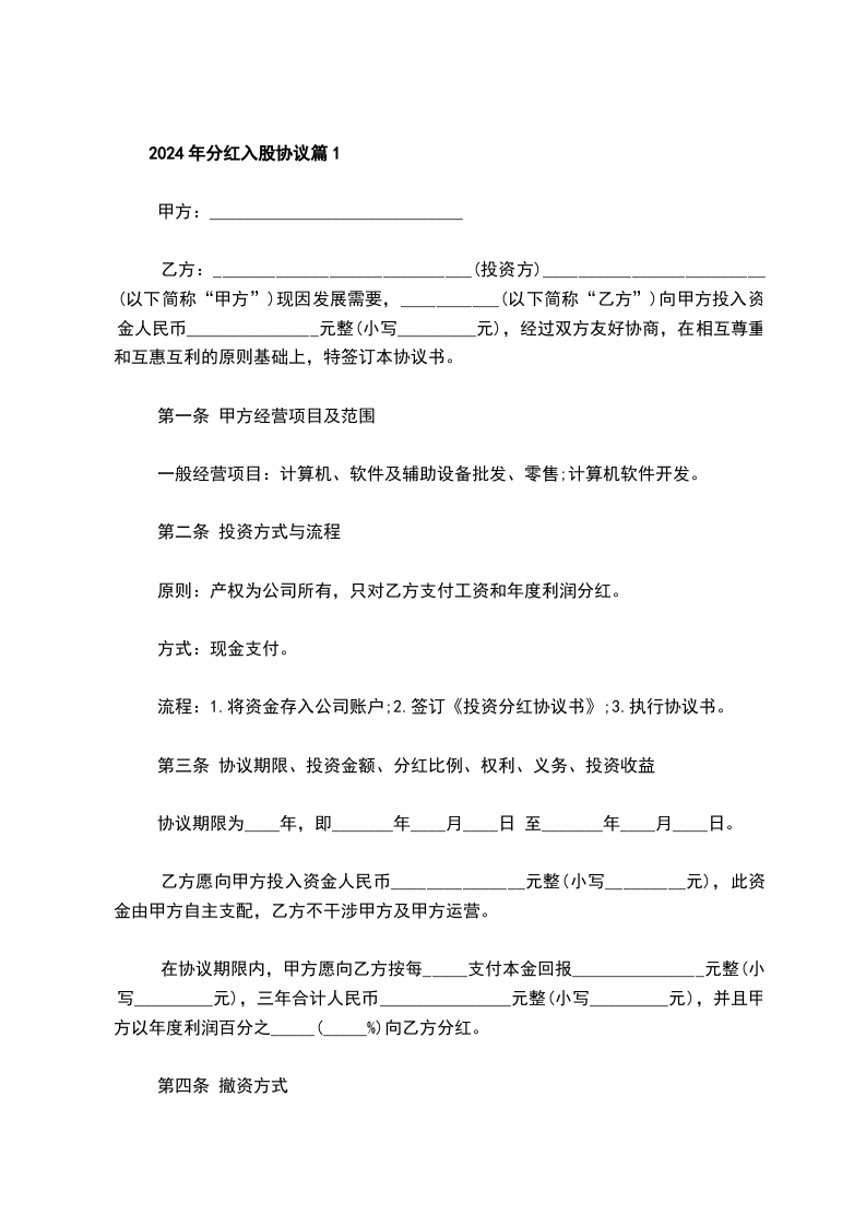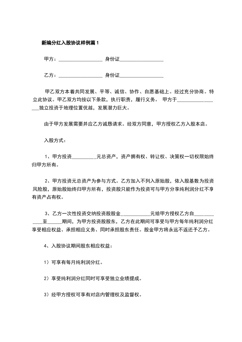 3、乙方一次性投资交纳投资股股金__________________元给甲方授权乙方自_____年_____月_____日至_____年_____月_____日期间,为甲方投资股股东,乙方在此期间可享受与甲方每年纯利润分红。享受相应权益、承担相应义务、同时承担股东责任。股金甲方将永远不返还予乙方。