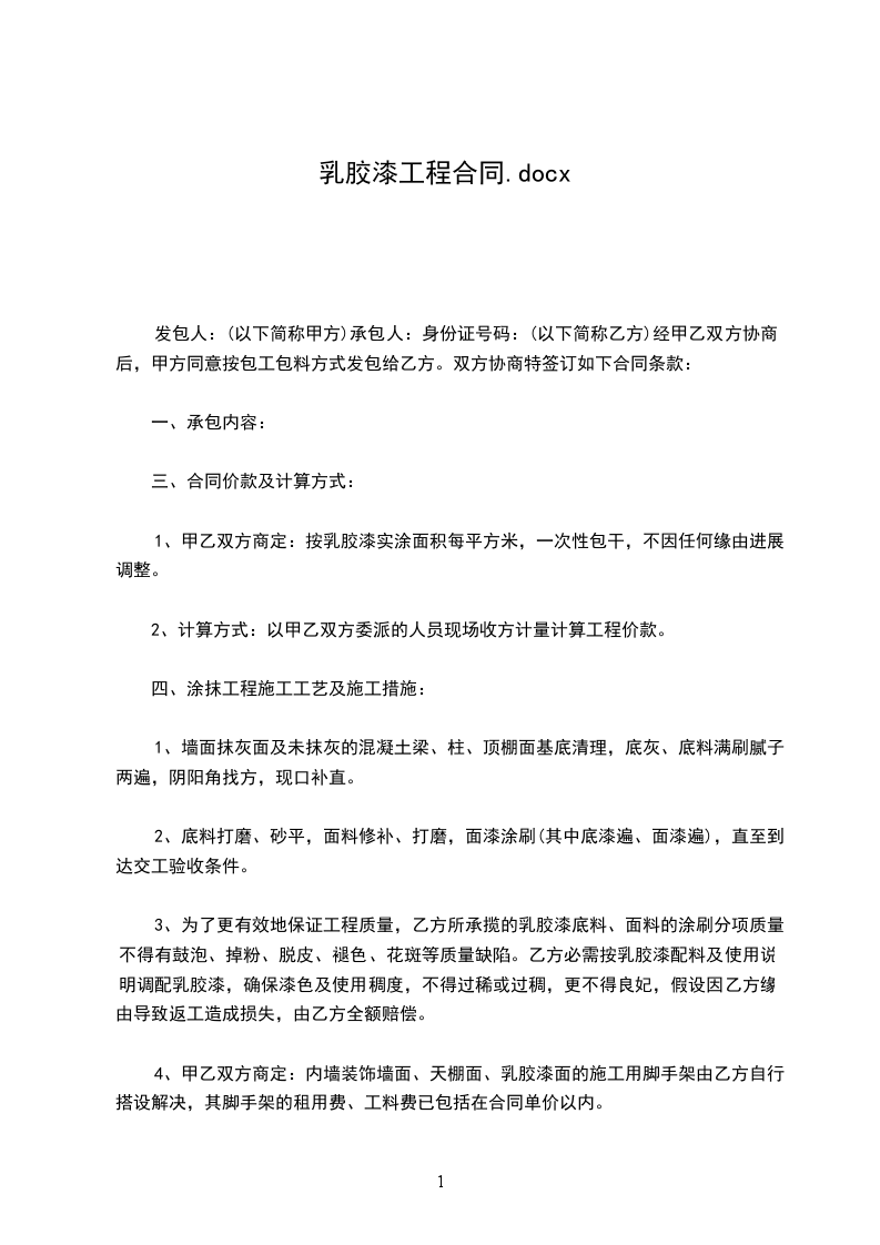 1、甲乙双方商定:按乳胶漆实涂面积每平方米,一次性包干,不因任何缘由进展调整。