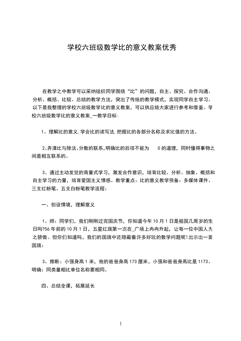 3、你知道吗?公元4世纪希腊数学家欧XX,利用线段找到了世界上最漂亮的几何比黄金分割,它的比值大约是0.618,比大约为23。介绍:黄金割应用特别广泛,国旗的宽与长的比是2比3,接近黄金分割,现在你们知道五星红旗为什么这么美观了吧!生活中还有许多地方用到黄金分割:T型台上选模特也要求模特的身长与腿长的比符合黄金分割。理发师也将黄金分割运用到发型设计中去。课后同学们还可以去调查。学校六班级数学比的意义教案_二教学内容:九年义务训练六年制学校数学课本第十一册“比的意义”。教学目标: