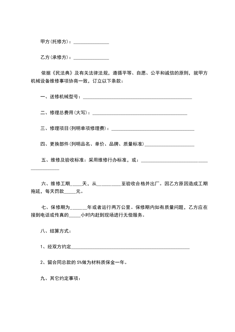 为了防止甲方因__________________设备维修保养不及时而导致不能正常工作造成的产财损失,乙方特此接受甲方委托。乙方为保证甲方设备的正常使用,对甲方的合同设备进行维修保养服务。为保护甲乙双方的合法权益,根据《中华人民共和国民法典》,甲乙双方遵循公平原则友好协商签订本合同。初次签合同前,设备应正常运转情况下,方可签订合同。合同内容如下: