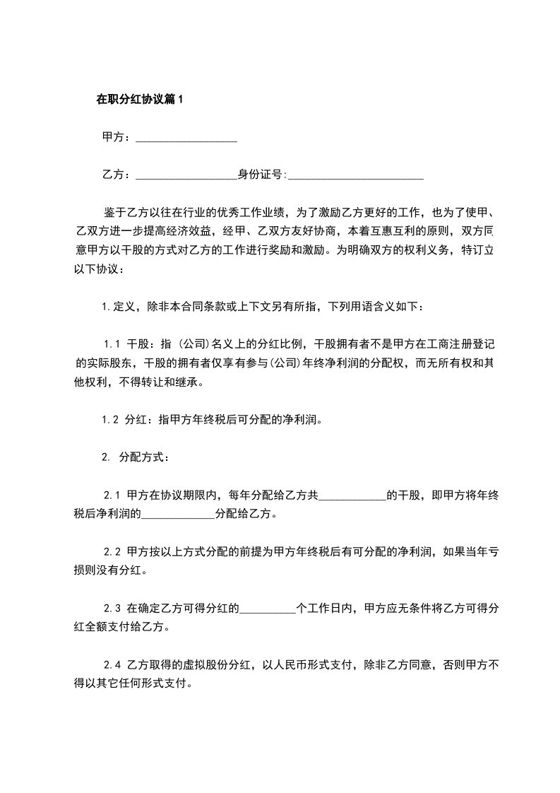 2、乙方所得红利比例为___%(以___税后可分配利润___为基准),通过___方式支付,并视公司的发展以书面形式每______年调整一次;